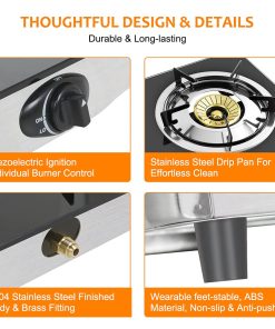 Parámetro del Producto Modelo No. TC02GB Potencia de Salida de Calor 19,000BTU Peso del Producto 15.9LB Tamaño del Producto 28.5 15.2 5.7INCH Peso del Paquete 19.2LB Tamaño del Paquete 29.7 16.7 4.5INCH Incluido en el Empaque del Producto -Estufa de mesa de doble quemador -Regulador de gas y manguera certificados por CSA, conector de gas de estándar americano -Manual de instrucciones -Conector de gas de estándar americano
