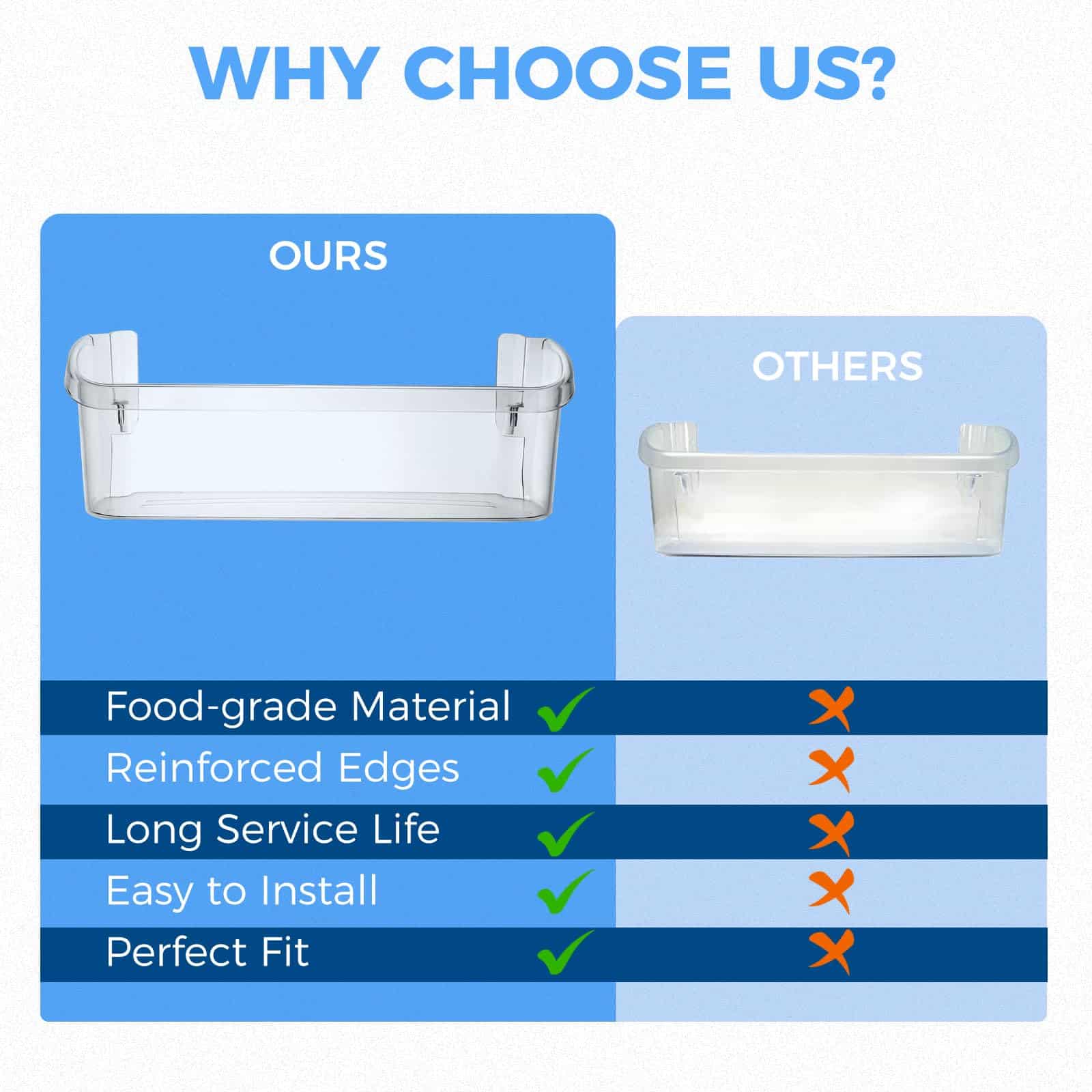 2. Número de parte de reemplazo: La repisa de puerta de refrigerador 242126602 reemplaza el número de parte 242126602, 4547407, PS12364199, AP6278233, EAP12364199, no encaja en 240323001, 240323002, 240363701. Por favor, tenga en cuenta que solo encaja en los 2 estantes en la parte inferior de la nevera, no en los 2 estantes superiores de la puerta.