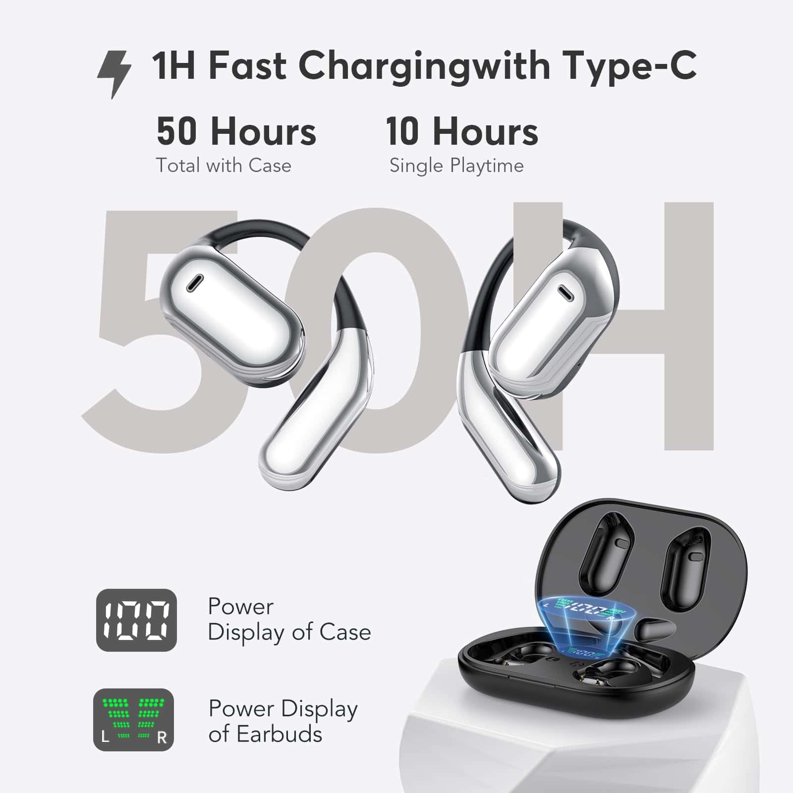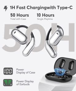 2. 50 horas de música ininterrumpida y pantalla digital LED: Nunca te preocupes por la duración de la batería nuevamente con los auriculares de oreja abierta YYK-Q16. La pantalla de cristal líquido digital LED en el estuche de carga te permite verificar el progreso de reproducción y los niveles de batería fácilmente, ya sea de día o de noche. Disfruta de impresionantes 10 horas de tiempo de reproducción con una sola carga, y extiéndelo a 50 horas utilizando el estuche de carga. El estuche se puede cargar completamente en solo 1.5 horas a través del cable Type-C de carga rápida (incluido).