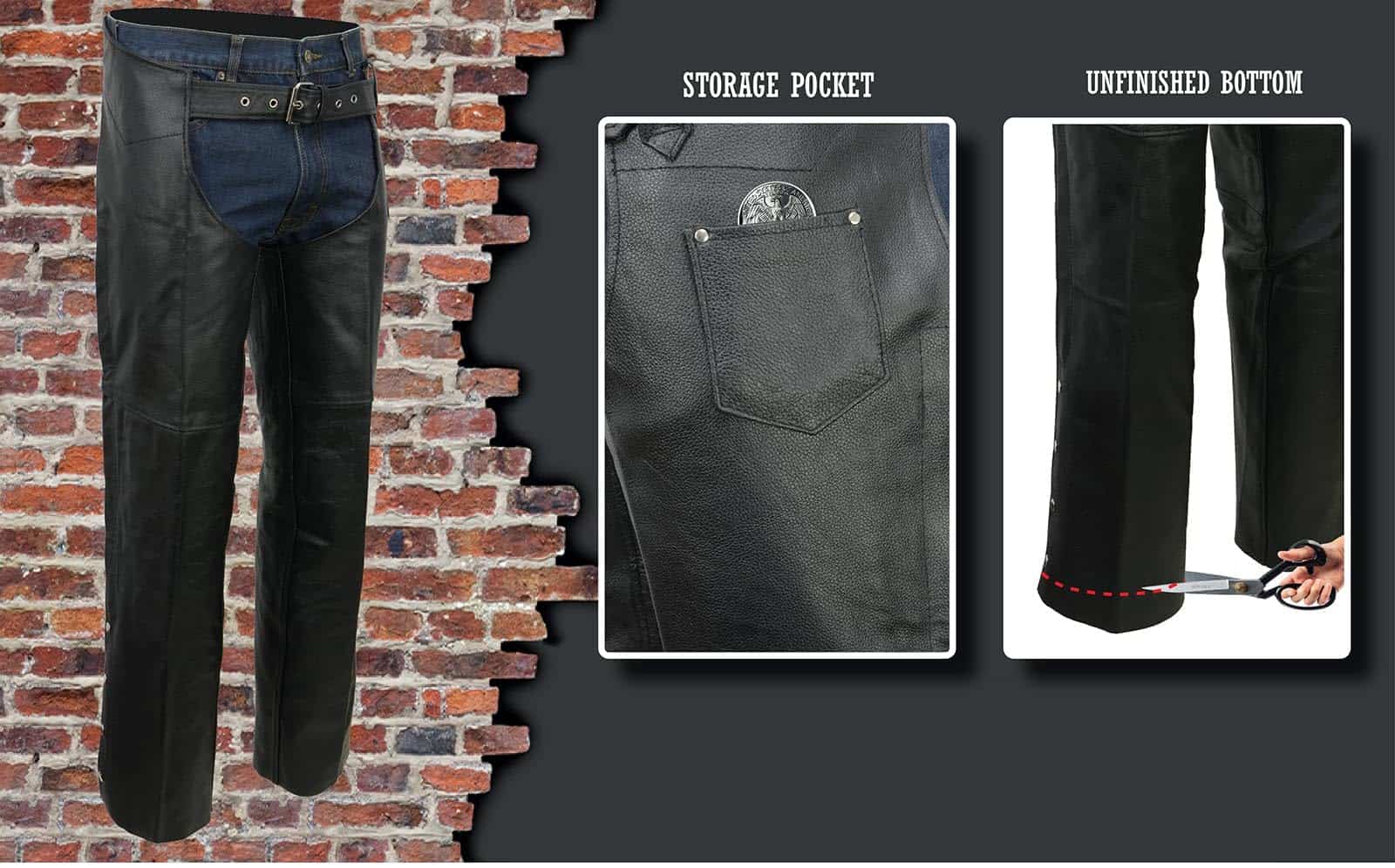 Parte inferior sin terminar: Descubre la versatilidad de nuestros pantalones de cuero para cowboys | cowgirls, diseñados con una parte inferior sin terminar para un ajuste fácil de la altura. Ahora tienes la libertad de personalizar la altura de los pantalones según tu preferencia, garantizando el ajuste perfecto y la comodidad óptima para tus aventuras en motocicleta. Acepta la flexibilidad y adaptabilidad de nuestros pantalones de cuero premium ajustables para hombres y mujeres. Usa unas tijeras pesadas y ajusta la altura a tu longitud perfecta