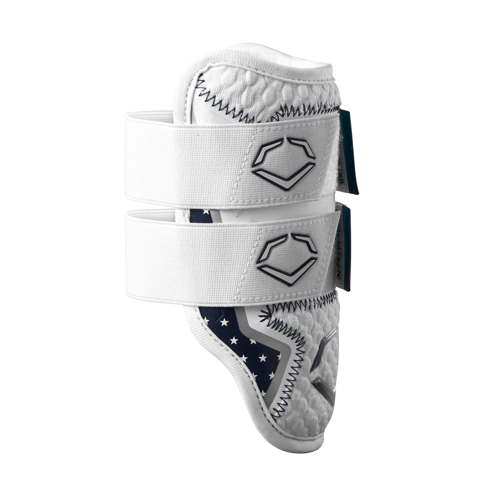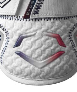 Estrellas y rayas se encuentran con seguridad y estilo. La Protección de Codo Doble con Doble Correa para Bateadores EvoShield X-SRZ Stars & Stripes presenta un aspecto patriótico en el escudo Tecnología Gel-to-Shell en la que los bateadores confían en el plato. Los logotipos en degradado van desde rojo a blanco a azul sobre la base de malla de punto tridimensional blanca, y los acentos laterales decorados con estrellas blancas y rayas rojas celebran la bandera de EE. UU. La malla de confort con un patrón de estrellas reviste el interior para controlar la humedad. Esta protección moldeable personalizada se adapta a la forma del brazo del jugador y ofrece cobertura hasta los tríceps para protegerse de los lanzamientos interiores en el plato.