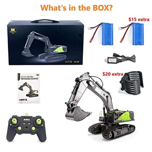 Nombre del producto: Huina 1593 RC Excavadora a escala 1:14 de 22 canales Frecuencia: 2.4Ghz Tiempo de juego: Aproximadamente 40 minutos Tiempo de carga: Aproximadamente 4 horas Batería de la excavadora: Batería de ion de litio 7.4V 1200mAh Batería del control remoto: 2 pilas AA (no incluidas) Distancia de control remoto: Aproximadamente 100 pies (33m) Función: Adelante, atrás, giro de 680 grados Empaque: Maletín Tamaño del producto: 54cmx19.5cmx48cm Incluye: 1 x Excavadora 1 x Control Remoto 2 x Baterías 1 x Cargador USB 1 x Manual de usuario