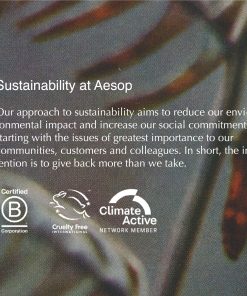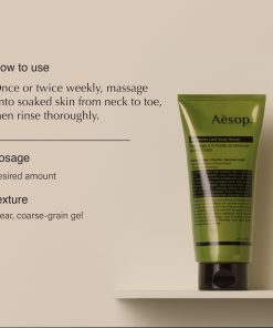 Exfoliante corporal Aesop Geranium Leaf es un producto imprescindible para aquellos que buscan una piel suave, hidratada y completamente limpia. Con una mezcla de tallo de bambú, pumita y hoja de geranio, este exfoliante proporciona una exfoliación profunda y efectiva, eliminando las impurezas y células muertas de la piel. Su aroma verde, cítrico y fresco brinda una experiencia sensorial única, mientras que su textura suave deja la piel fresca, suave y renovada. Para obtener mejores resultados, se recomienda utilizar el exfoliante una o dos veces por semana, masajeando sobre la piel mojada y luego enjuagando completamente. Además, todos los productos de Aesop son veganos, garantizando que solo se utilizan ingredientes seguros, eficaces y sostenibles. ¡Pruébalo hoy y disfruta de una piel radiante y saludable!