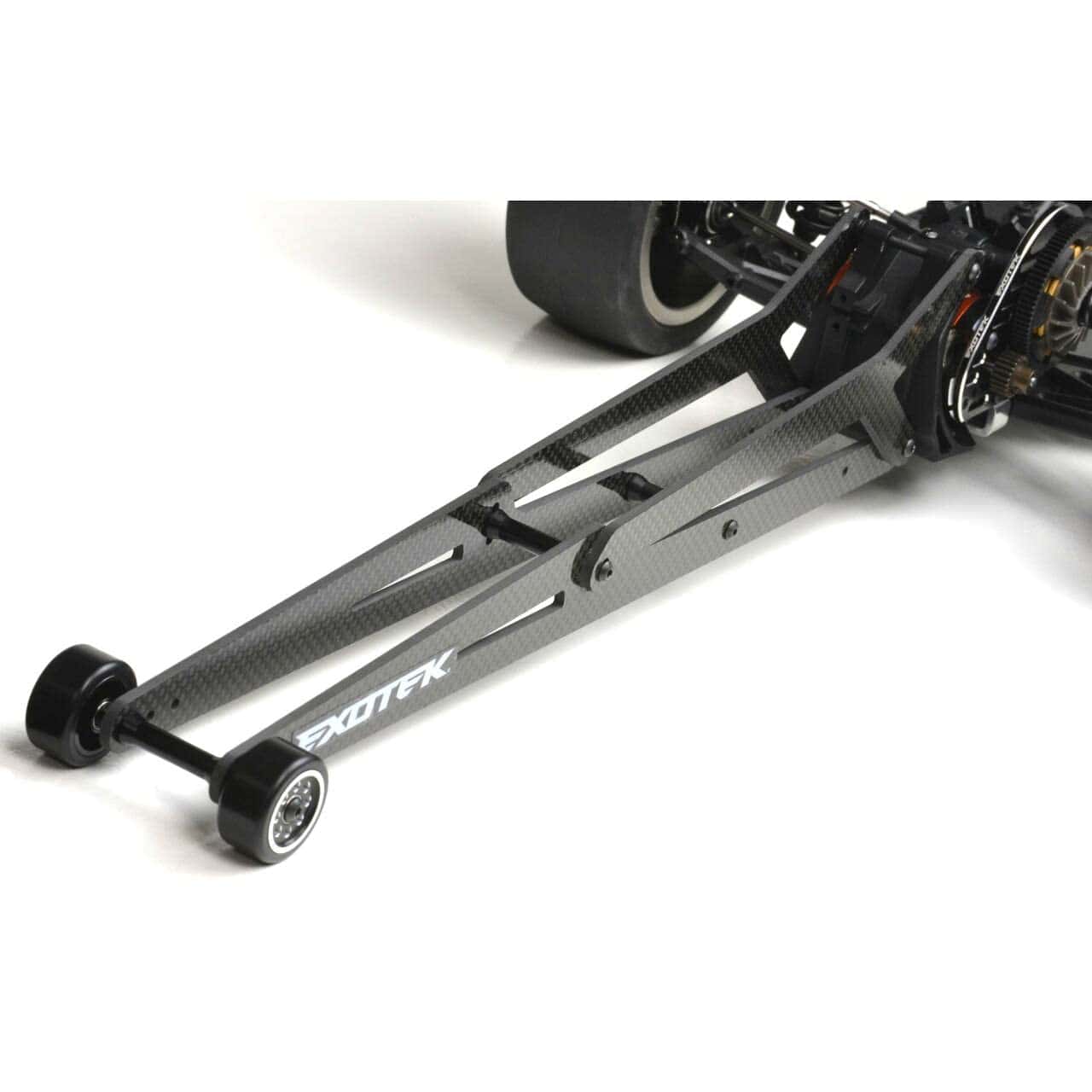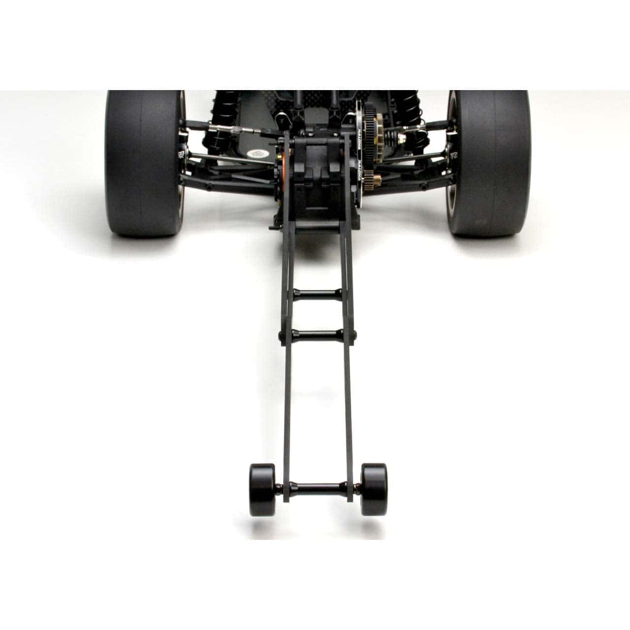 Rueda trasera de carbono extra larga para estabilidad adicional en el Losi 22S RC Drag Car. Legal para competencias. Ajuste rápido de 2 tornillos para elevar o bajar la barra.