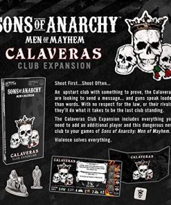 Dispara primero. Dispara a menudo. Un club recién llegado con algo que demostrar, los Calaveras buscan enviar un mensaje. Y las armas hablan más alto que las palabras. Sin respeto por las leyes o sus rivales, harán lo que sea necesario para ser el último club en pie. La violencia resuelve todo. La Expansión del Club Calaveras incluye todo lo que necesitas para añadir a un jugador adicional y a este nuevo y peligroso club a tus partidas de Sons of Anarchy: Men of Mayhem. Contiene: 1 Tarjeta de Clubhouse, 1 Banda de Jugadores, 10 muñecos de plástico, 78 fichas y 1 dado.