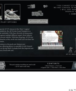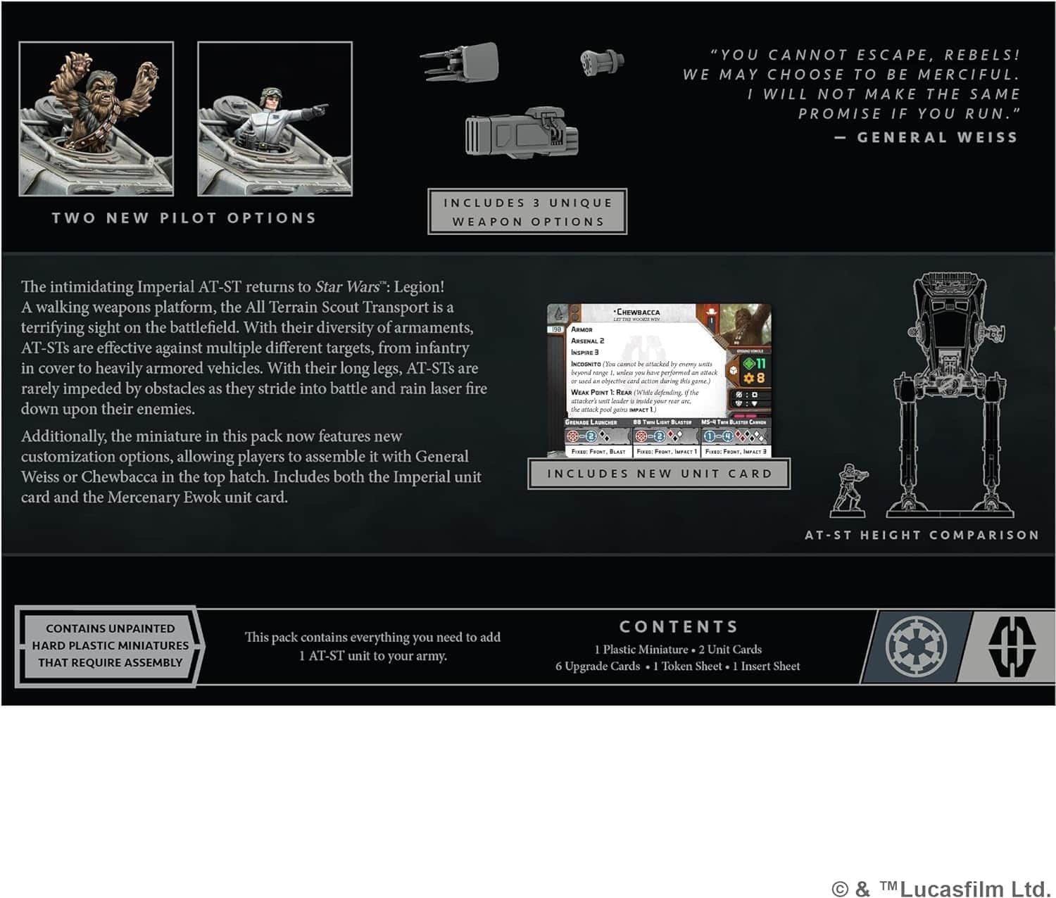 ¡El imponente AT-ST imperial regresa a Star Wars: Legion! Con una nueva ingeniería que permite una mejor experiencia de ensamblaje, el AT-ST en este paquete añade potencia de fuego a cualquier ejército. Además, la miniatura en este paquete ahora presenta nuevas opciones de personalización, permitiendo a los jugadores ensamblarlo con el General Weiss o Chewbacca en la escotilla superior. Finalmente, este paquete incluye tanto la tarjeta de unidad imperial como la tarjeta de Chewbacca que se encuentran en SWL110 – Logray & Wicket, invitando a los jugadores a explorar todas las posibilidades que esta unidad tiene para ofrecer de inmediato.
