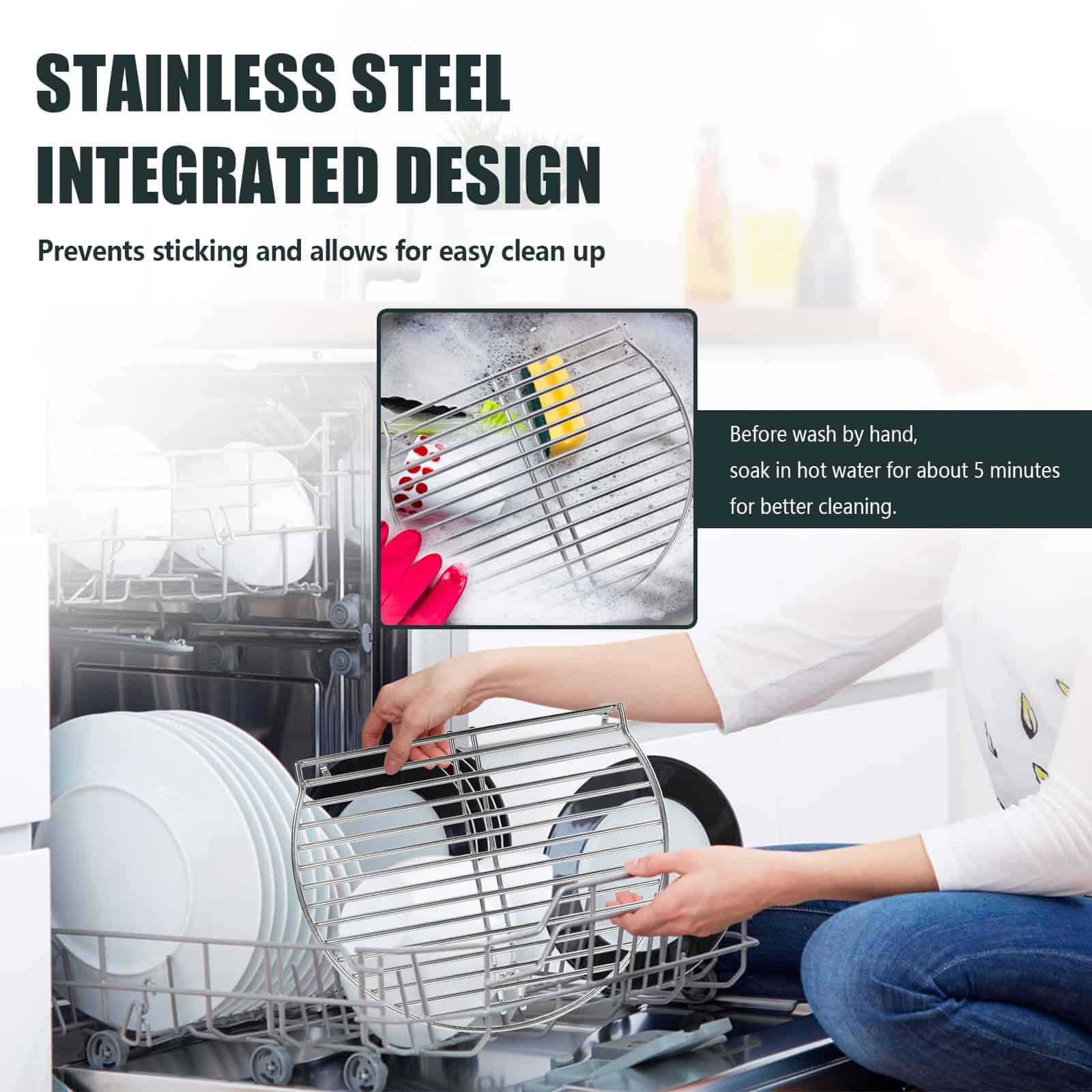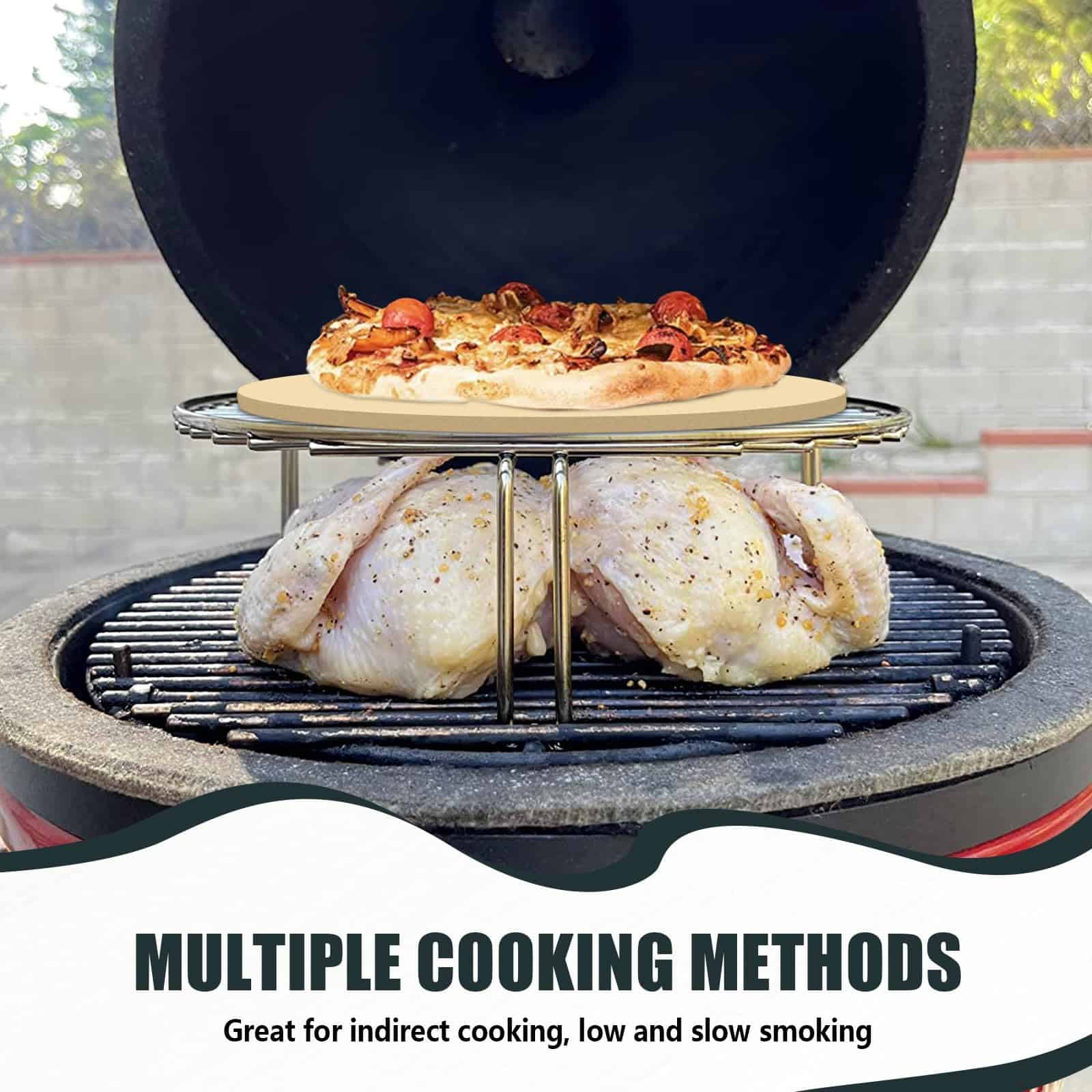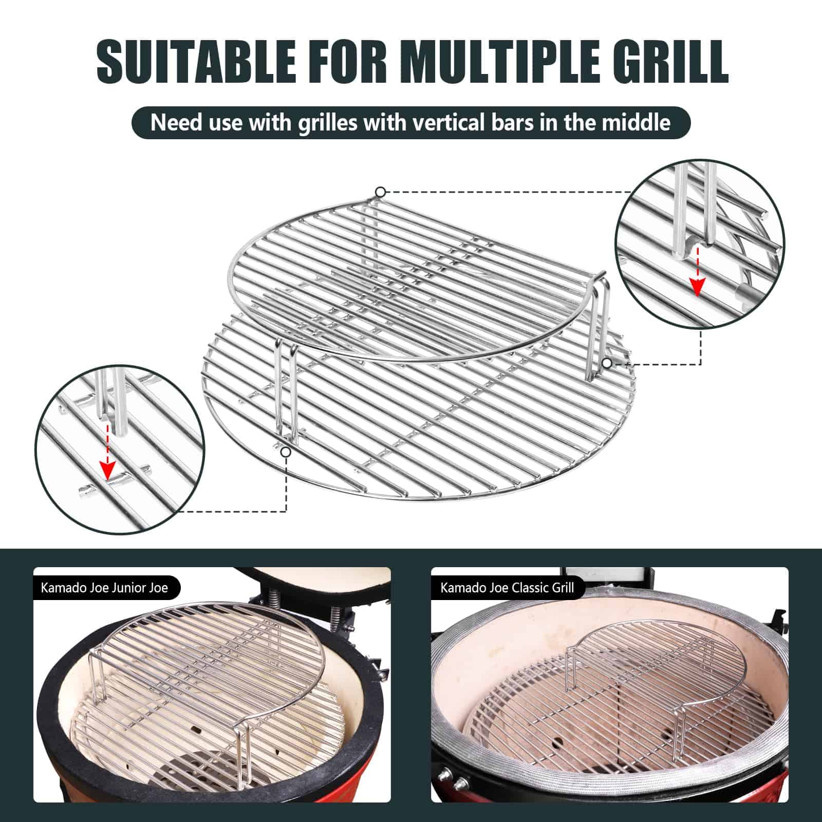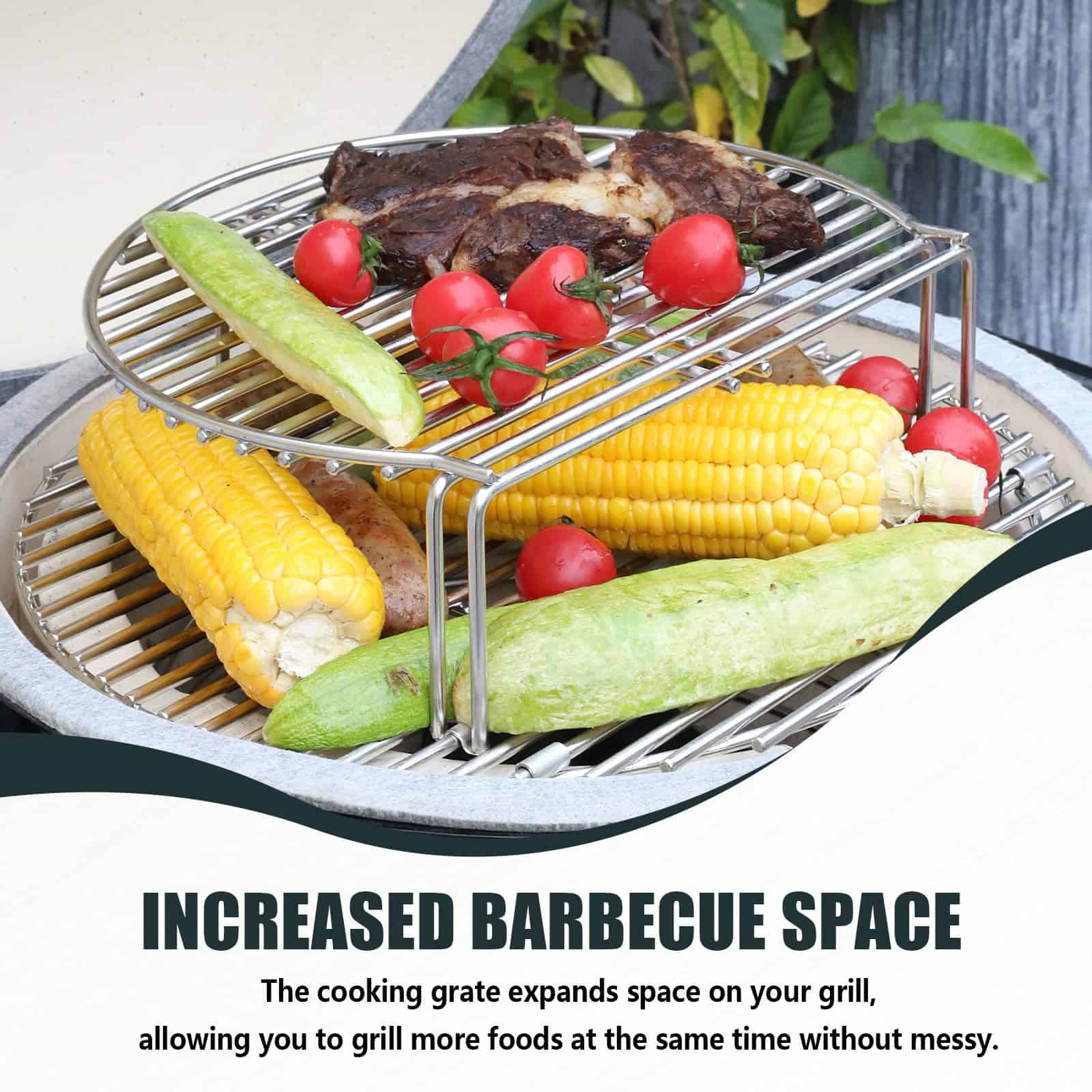 Añade un 60% más de área de cocción a tu parrilla con este expandidor de parrilla de acero inoxidable. El expandidor se coloca de manera estable en la rejilla de la parrilla con pies ranurados, convirtiéndose en una parrilla de barbacoa de dos niveles, agregando más superficie de cocción a la parrilla, manteniendo verduras, carnes y otros alimentos de barbacoa lejos del fuego. Mantiene tus alimentos calientes y calientes, nunca dejando que tu comida se enfríe en reuniones grandes. El expandidor también es útil para cocinar indirectamente, añadiendo una área muy necesaria cuando necesitas más espacio o una zona de temperatura diferente. Puedes colocar una sartén de agua debajo en la estantería original y mantener la humedad en la parrilla mientras ahúmas carne o pescado en este expandidor de parrilla, o cocinar carne abajo y pizza en piedra arriba. Las patas estables del expandidor de parrilla son de acero inoxidable con 3 patas con pies ranurados para levantar la rejilla a la altura adecuada, se coloca cómodamente directamente en tu parrilla, asegurando una colocación de alimentos más suave. Nota: Utilizar con parrillas con barras verticales en el medio. El bastidor del expandidor de parrilla está hecho de acero inoxidable 304 material de grado alimenticio, construcción de metal resistente a la oxidación para una mayor resistencia al calor y una vida útil más larga, seguro para el contacto con alimentos. Fácil de usar y limpiar, apto para lavavajillas.
