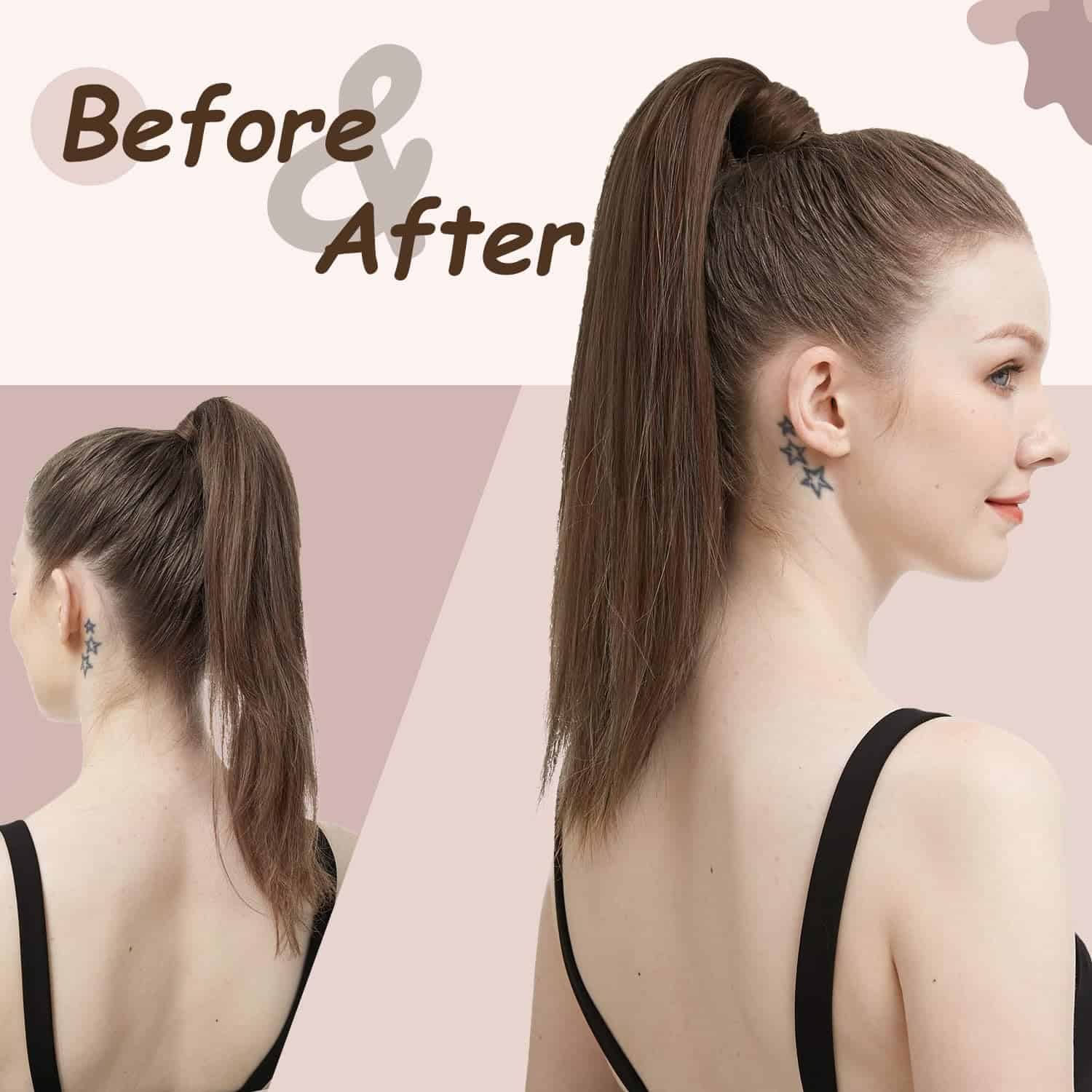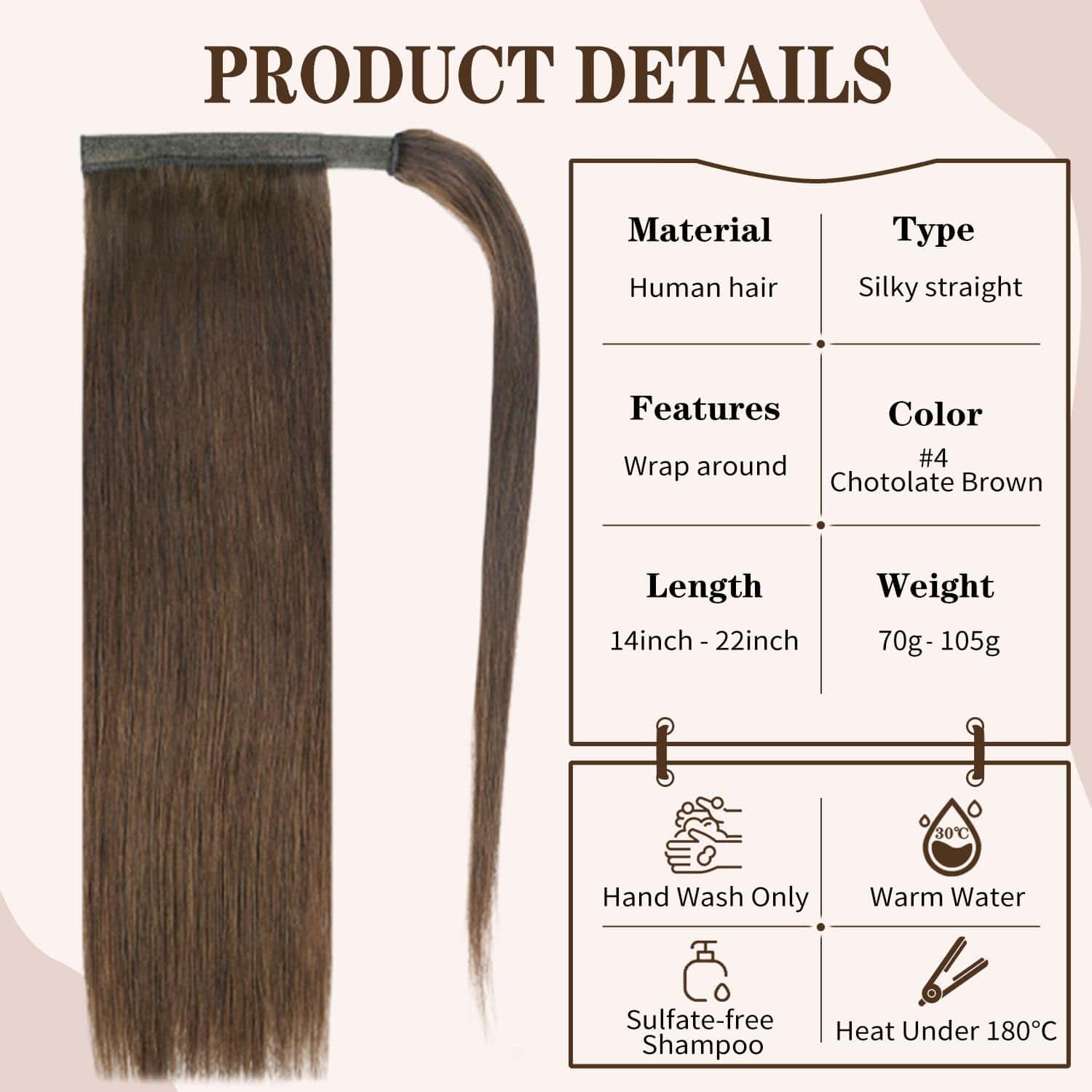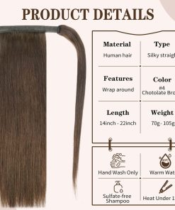 Extensión de Cola de Caballo de Cabello Humano de 16″ 75g #4 Marrón Chocolate 100% Cabello Humano Remy Envoltura Alrededor Larga Extensión de Cabello Clip en Cola de Caballo Recta Una Pieza Postizo para Mujeres (16″, Marrón Chocolate) – 1. Real Human Hair Ponytail Hair Extensions: 100% extensiones de cabello humano remy, calidad de salón, sin enredos, sin caída, suave como la seda, nuestras extensiones de cola de caballo de cabello humano se pueden teñir, reforzar, rizar. ¡Solo unos segundos y obtendrás una cola de caballo larga y gruesa como magia! 2. Wrap Around Ponytail: Extensiones de cola de caballo con un práctico peine clip-on y banda de pelo con pegamento mágico, añade volumen y longitud a tu melena para una transformación hermosa al instante! Adopta un diseño de red de encaje transpirable, sin sensación de atadura y sin irritación en el cuero cabelludo. 3. Most Fashionable Color: Color marrón chocolate, diseño natural de tono cálido para ti. Combina perfectamente con el color de tu cabello. Disparo de luz, función de cámara, diferentes monitores y otros factores que afectan, el color puede ser diferente. 4. Suitable for Different Occasions: Las extensiones de cola de caballo son un accesorio perfecto para cualquier ocasión, como uso diario, citas, reuniones, bodas, fiestas. ¡Asegura bien y cómodamente todo el día. También es un regalo de moda para tus amigos y familiares! 5. Excellent Customer Service: Si hay algún problema cuando recibas las extensiones de cola de caballo, contáctanos sin dudarlo, lo resolveremos de manera oportuna. Nuestro objetivo es ofrecerte el mejor servicio y el mejor producto.