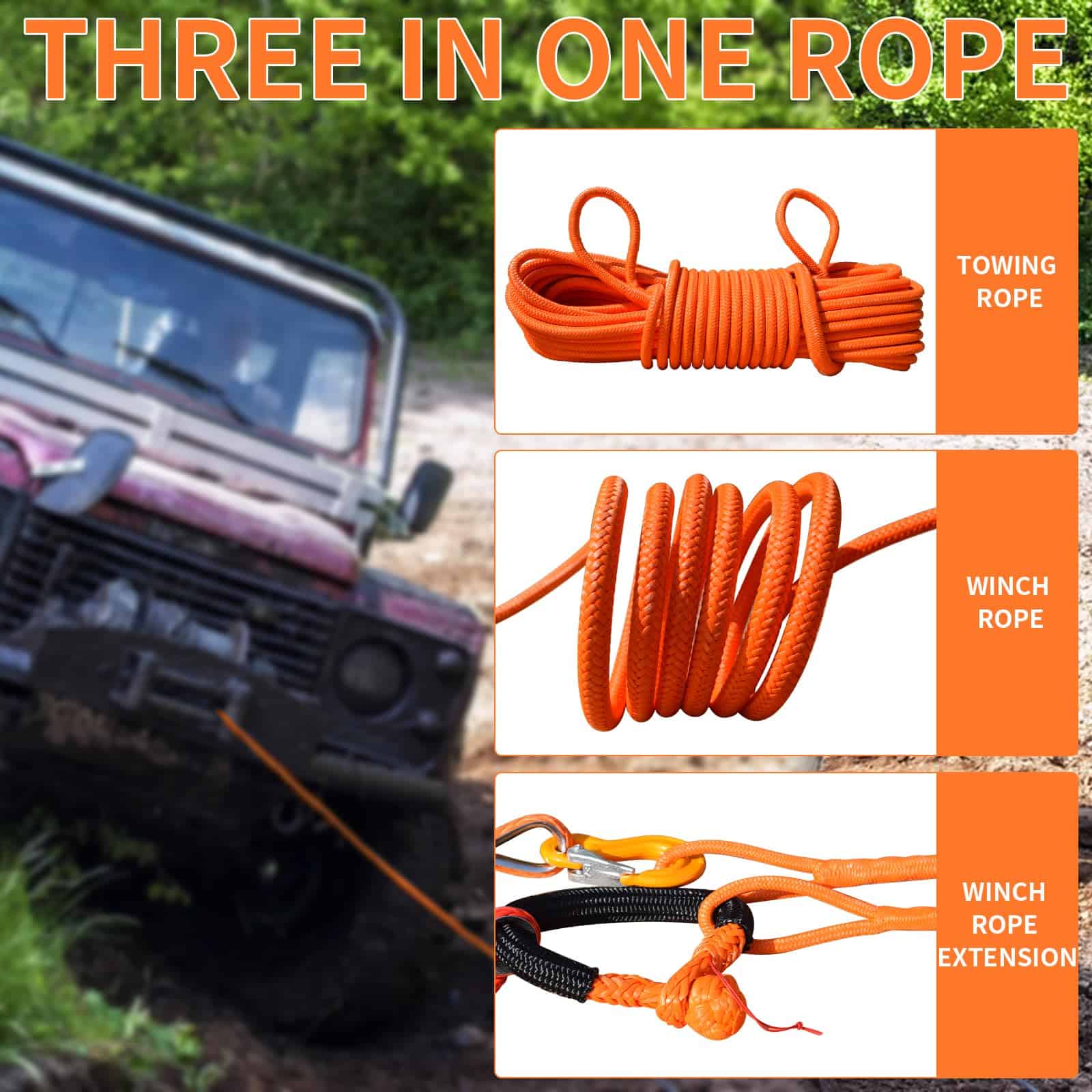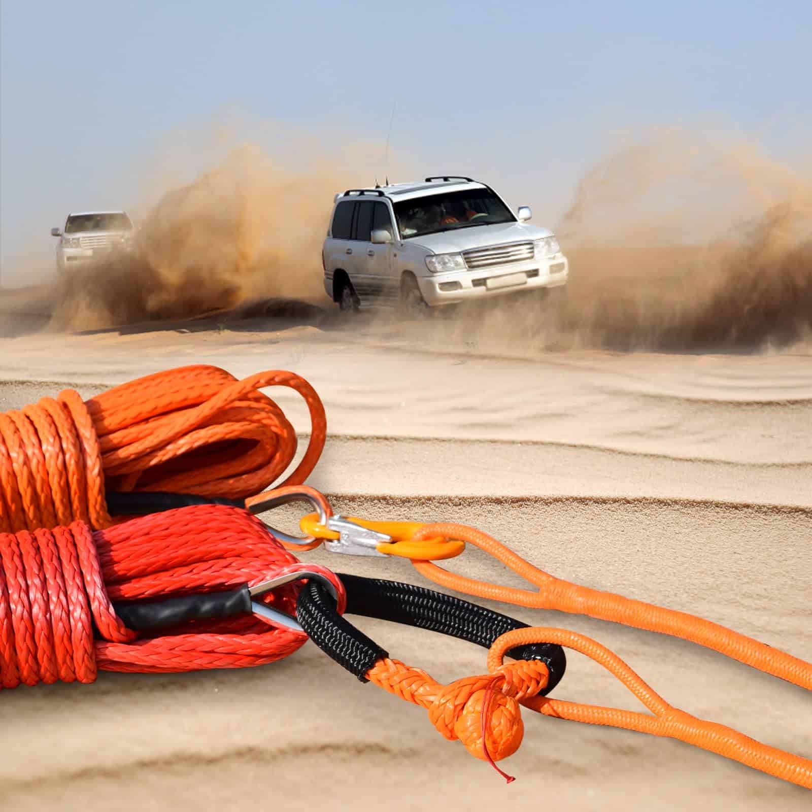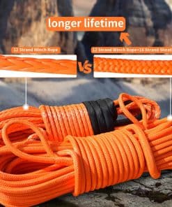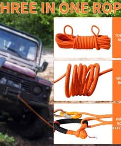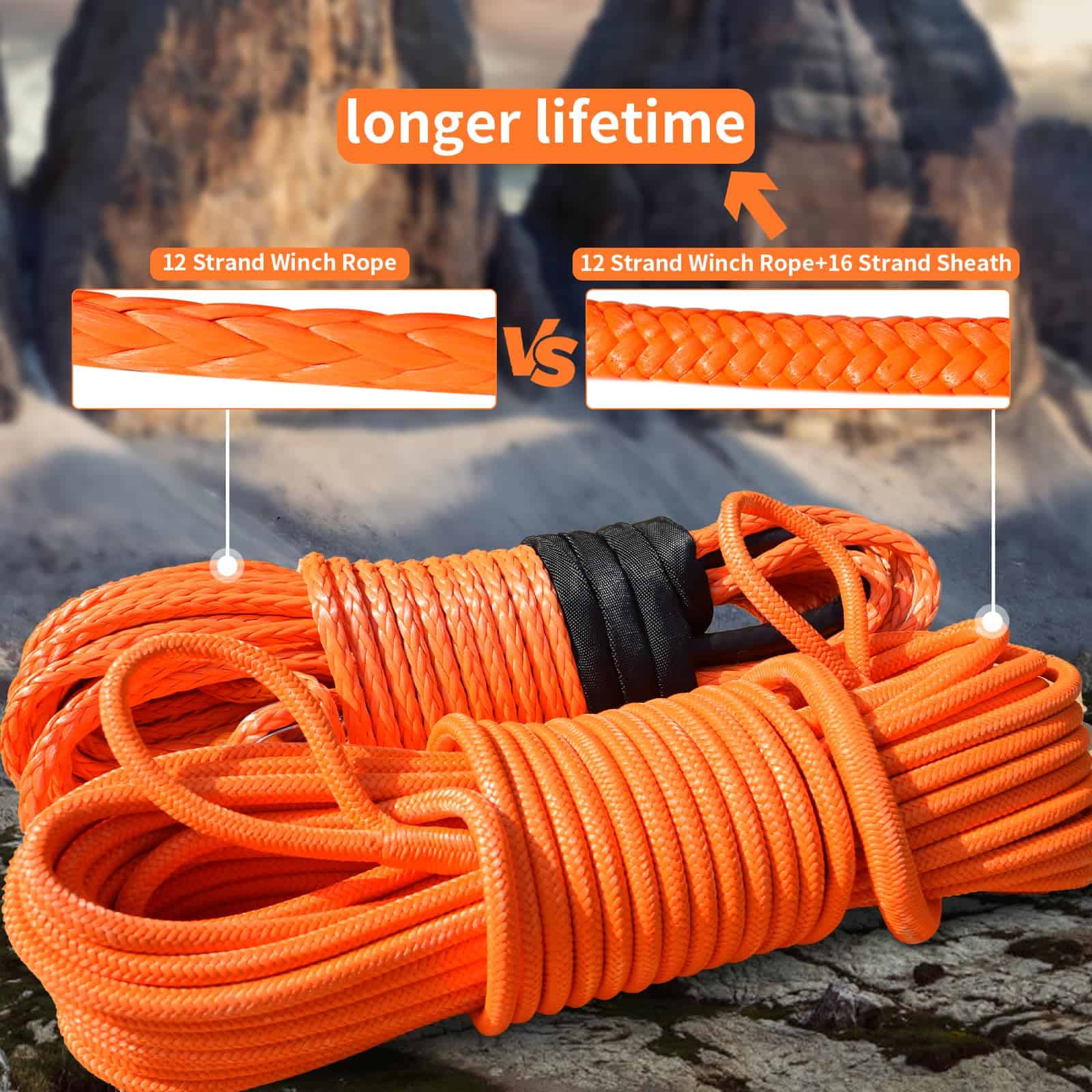Cuerda de winch de doble trenzado QIQU. Esta extensión de cuerda de winch está hecha por dos capas, el núcleo interno es una cuerda de winch de 12 hilos y la funda exterior se utiliza para proteger el núcleo interno. Tamaño y resistencia a la rotura: 3/8 pulgadas 50 pies o 3/8 pulgadas 100 pies. Esta extensión de cuerda de winch proporcionará una doble protección debido a la estructura de dos capas cuando la cuerda se rompa. La funda trenzada firmemente protegerá la cuerda principal contra el agua y la arena. Se puede utilizar como cuerda de winch, extensión de cuerda de winch o cuerda de remolque. Puede conectar la cuerda de winch directamente o a través de un grillete suave. Es un poco rígido, no tan suave como imaginas.