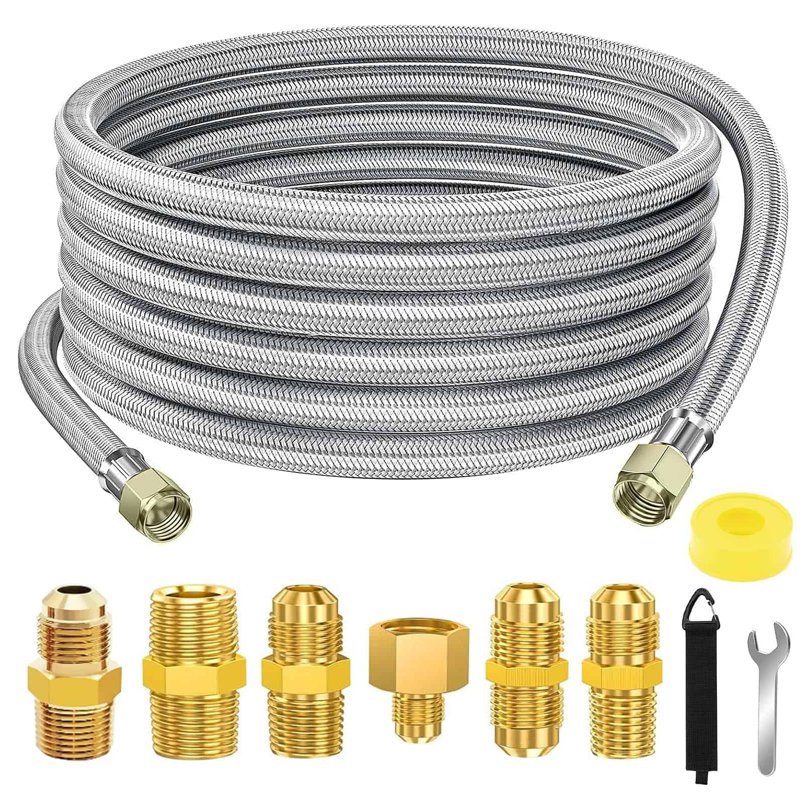 4. Conexión Fácil y Segura: Esta manguera de propano de acero inoxidable trenzada de alta presión de 24 pies con 6 tipos diferentes de adaptadores de acoplamiento de conversión. La extensión de la manguera de propano cuenta con un conector giratorio de fácil uso manual, que permite una conexión rápida y segura a su tanque de propano o manguera existente. La conexión segura garantiza un funcionamiento sin fugas, brindando tranquilidad durante las actividades al aire libre.