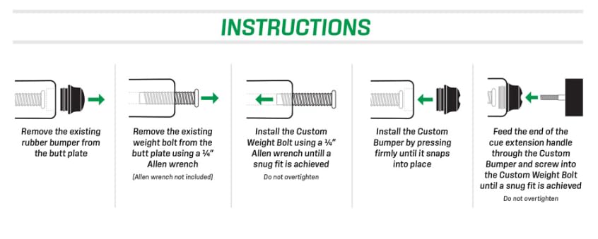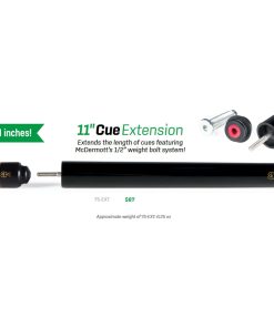 Esta extensión se ajusta al extremo del taco de cualquier McDermott, Star o Lucky cue que presente el sistema de perno de peso de 1/2 de McDermott. Incluye perno de peso y tapa de extremo de repuesto. Añade 11 pulgadas de longitud al taco.