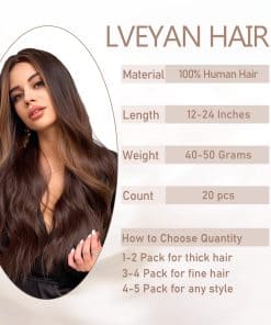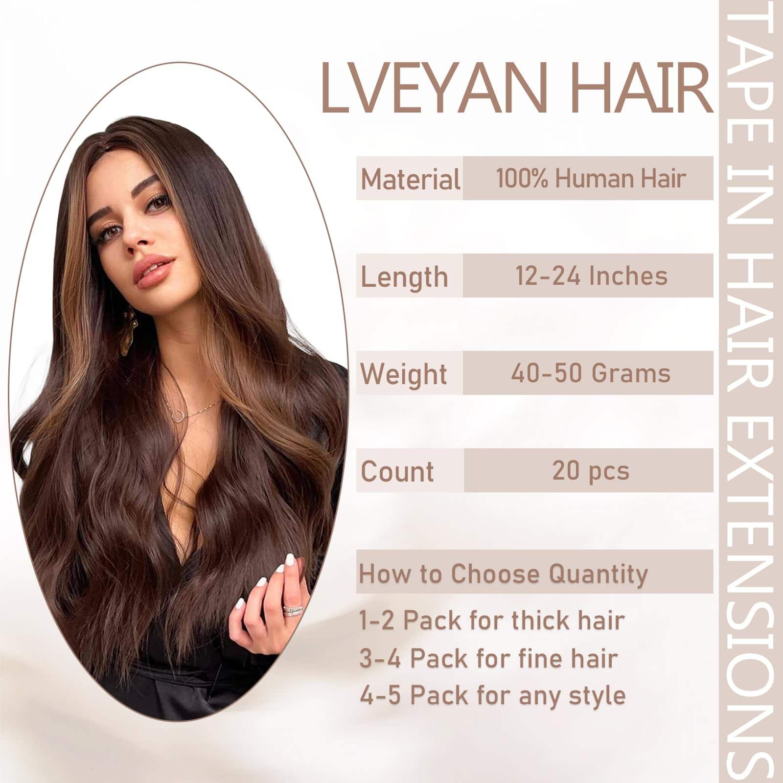 3. Embalaje y Especificaciones de Extensiones de Cinta: Extensiones de Cinta Lveyan de pelo, 20 piezas, 12 pulgadas-14 pulgadas: 40g/pack , 16 pulgadas-24 pulgadas: 50g/pack, cada paquete viene con cinta de repuesto. hay muchos colores para elegir, Según el volumen de su propio cabello, generalmente 2-3 paquetes pueden llenar toda su cabeza, aumentando longitud y volumen. Si tiene el cabello fino, recomendamos comprar más de 3-5 paquetes para lograr un resultado perfecto.