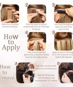 4. Mantenimiento de Extensiones de Cabello Adhesivas de Cinta: Si necesita alisar o rizar extensiones de cinta, controle la temperatura por debajo de 180, teñido de claro a oscuro. Use un champú y acondicionador suaves, lave suavemente con agua tibia a lo largo de la textura y permita que se sequen al aire para obtener mejores resultados. Cuidado adecuado para mantener su suavidad y brillo.