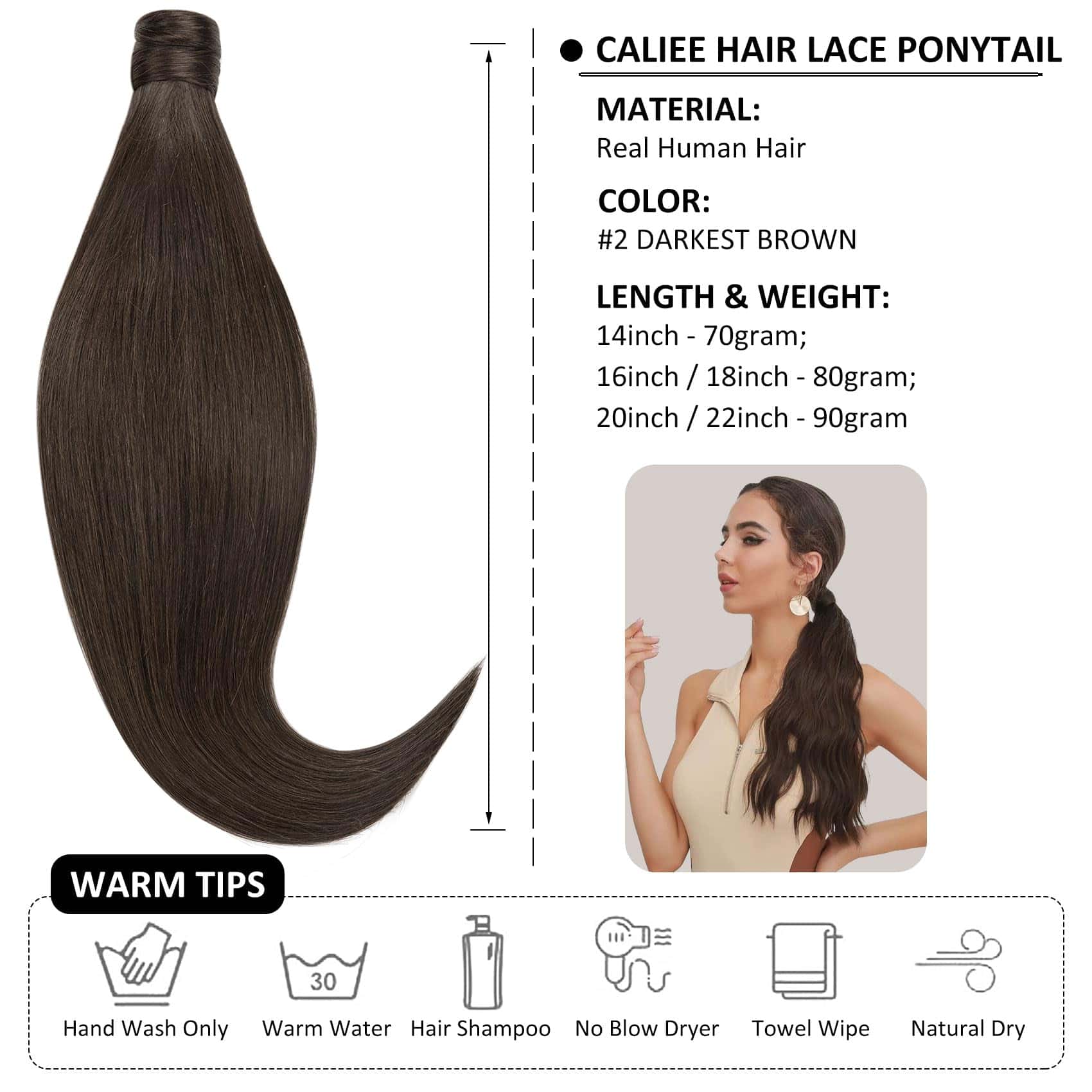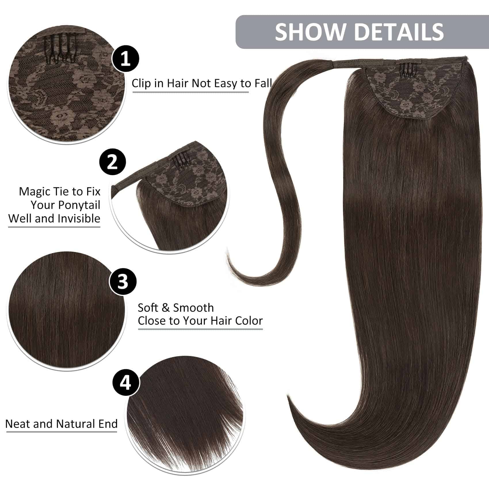 1. Textura de Cabello Humano Hecho con cabello humano de alta calidad y saludable, libre de enredos y sedoso suave, puedes lavar, cortar, teñir, rizar o alisar como tu propio cabello. Cabello con grosor bien elaborado de arriba a abajo, agregando longitud y volumen a una cola de caballo pequeña/delgada.