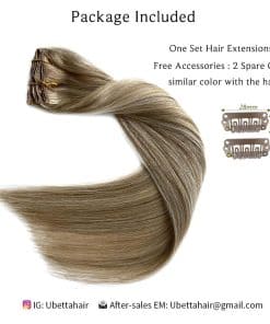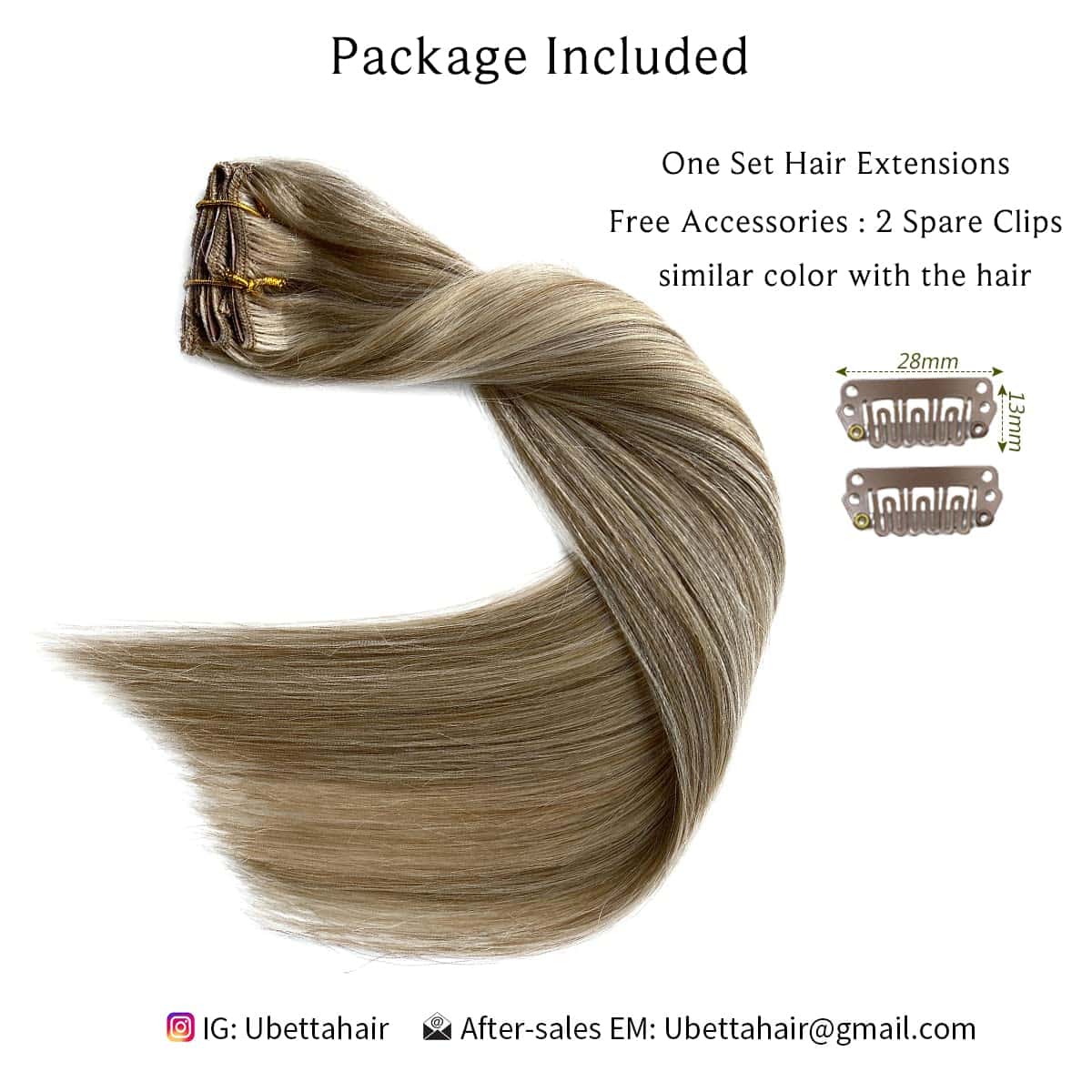 2. Especificación de las Extensiones de Cabello Ubetta – Las extensiones de cabello humano clip en cabello están hechas con doble trama bien elaborada, con un grosor de arriba a abajo. 7 piezas 70G (2.45oz)/paquete con 16 clips de acero inoxidable cosidos. Diseñado para chicas, mujeres novias para agregar volumen, longitud o reflejos a su propio cabello. Todos los colores de las extensiones de cabello son exactamente como se muestran en las imágenes, muy ligeras diferencias de color debido a la iluminación, monitores y configuración es normal.