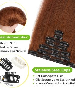 Con 7 piezas de extensiones de clip en un color castaño claro de 14 pulgadas de longitud y 75g de peso, puedes personalizar tu look agregando solo unas pocas piezas para dar volumen o todas ellas para una cabeza completa y exuberante de cabello. Las extensiones están equipadas con 16 clips por juego para una fácil aplicación y remoción.