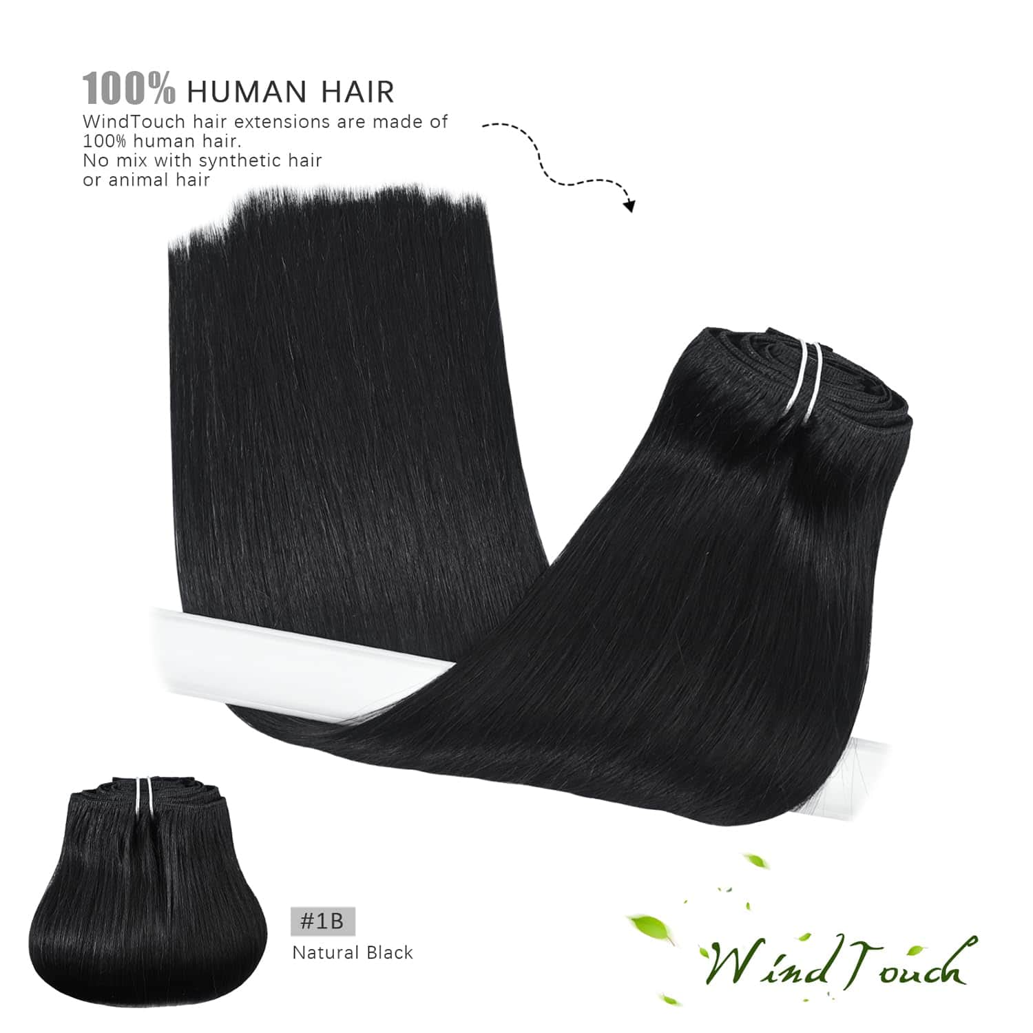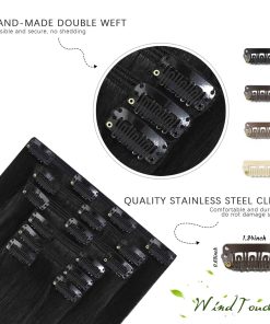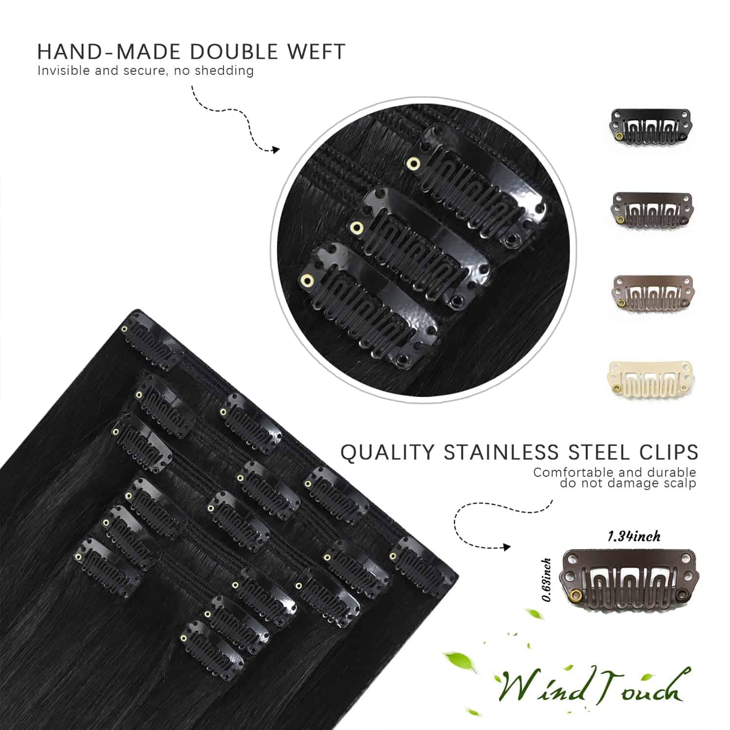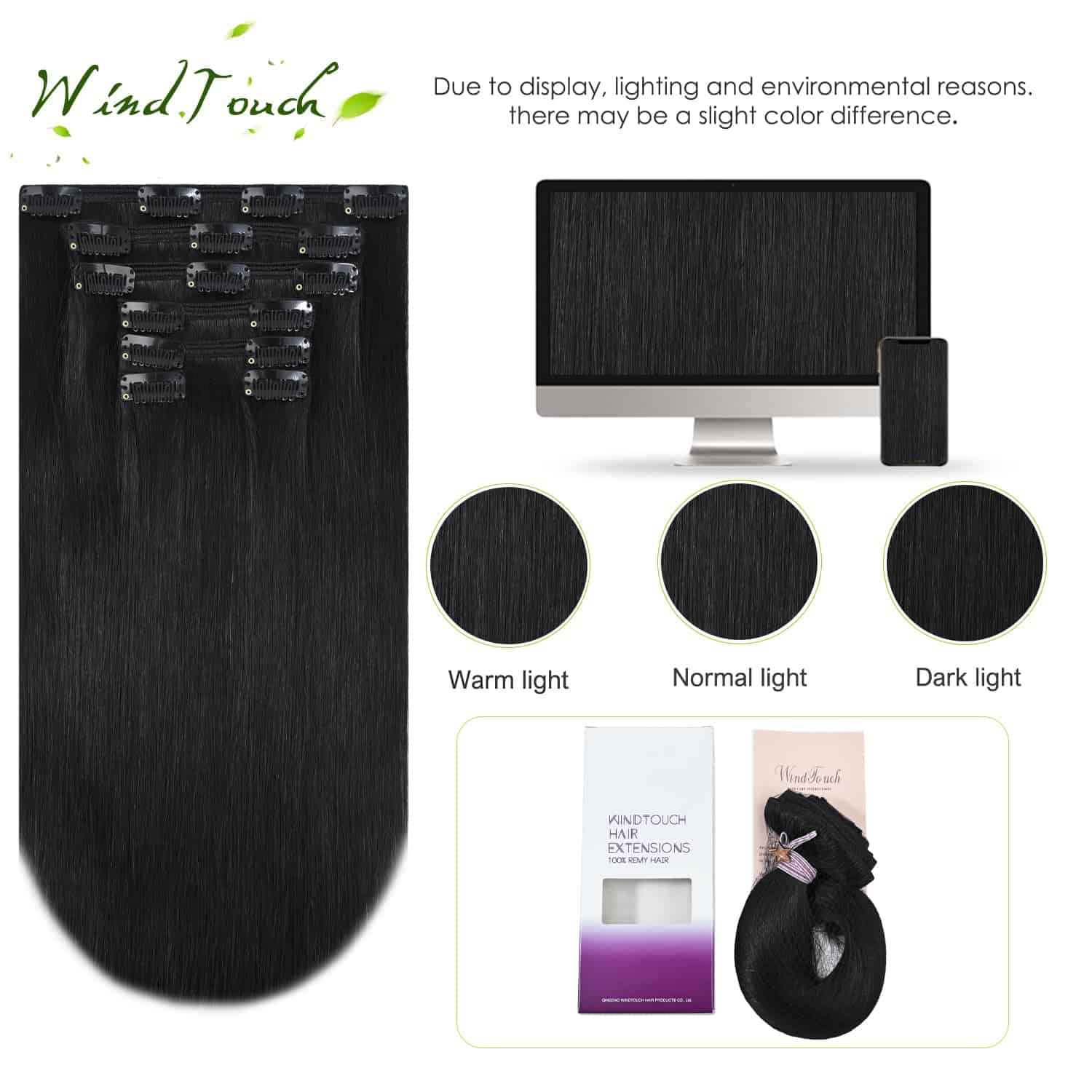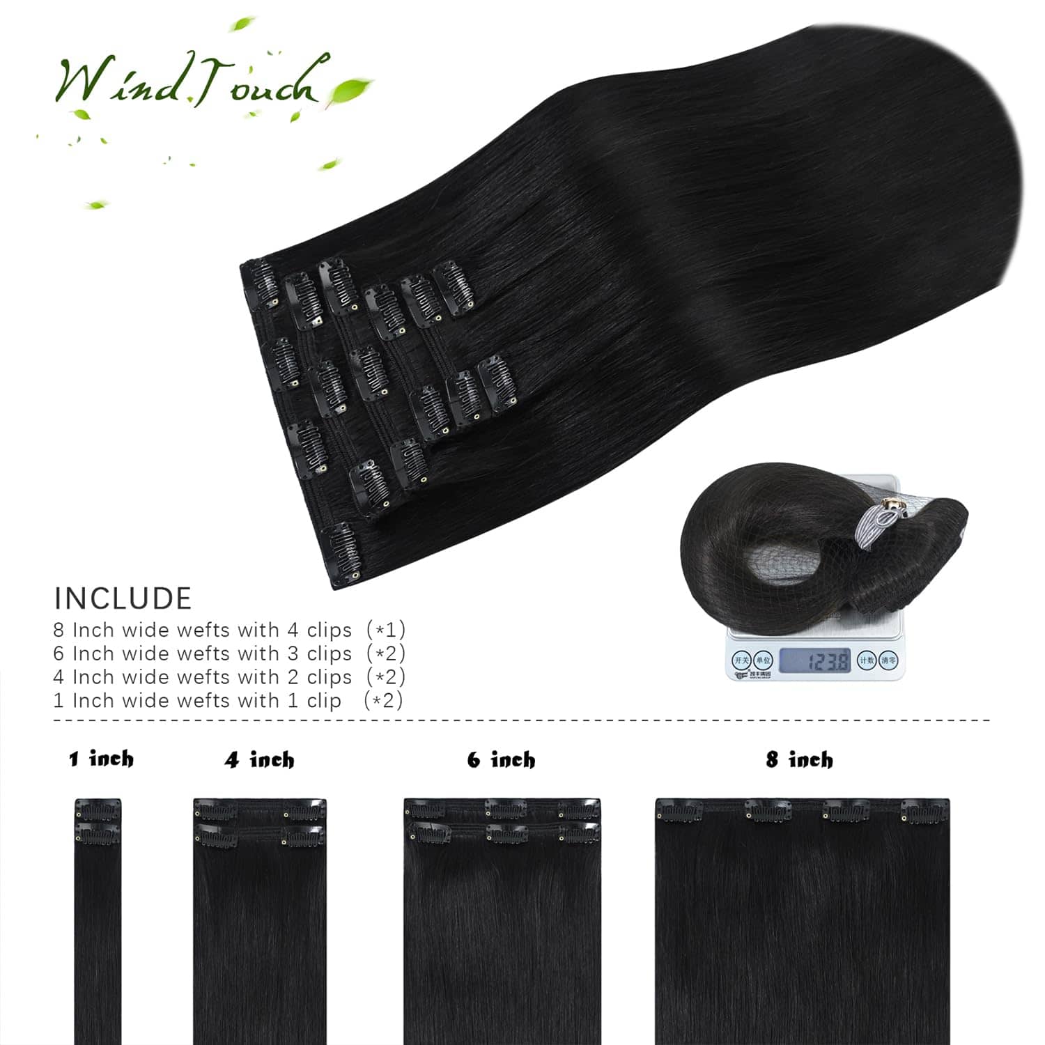 1. Alta calidad: Las extensiones de cabello clip in WindTouch son 100% de cabello humano real con una textura suave y suave, tan bueno como tu propio cabello. Las extensiones de cabello WindTouch valen cada centavo, son muy gruesas. Cada paquete de extensiones de clip en el cabello es de 120g. Por lo general, un paquete es suficiente para toda tu cabeza.