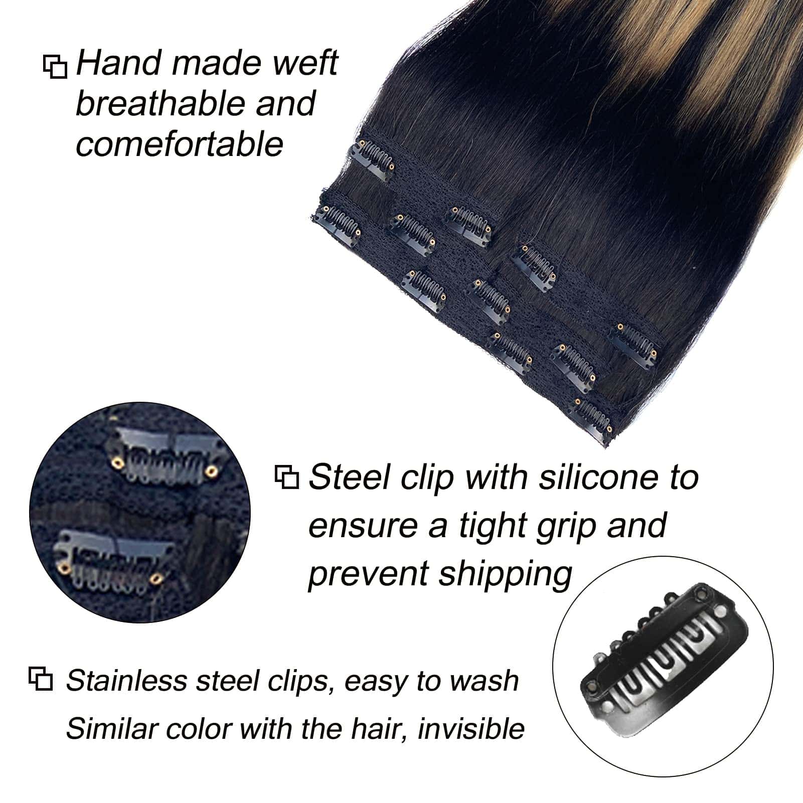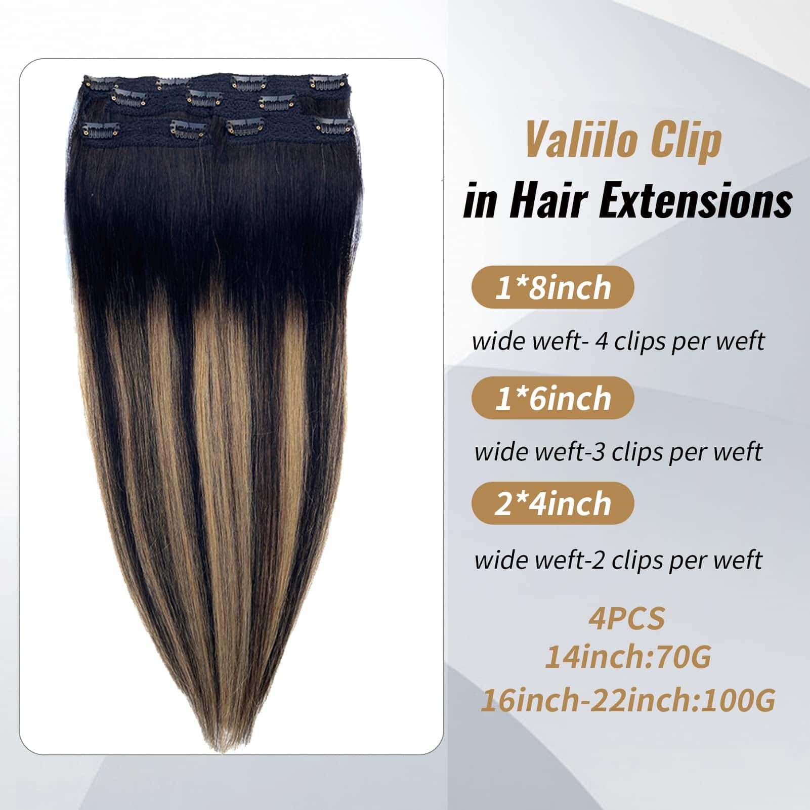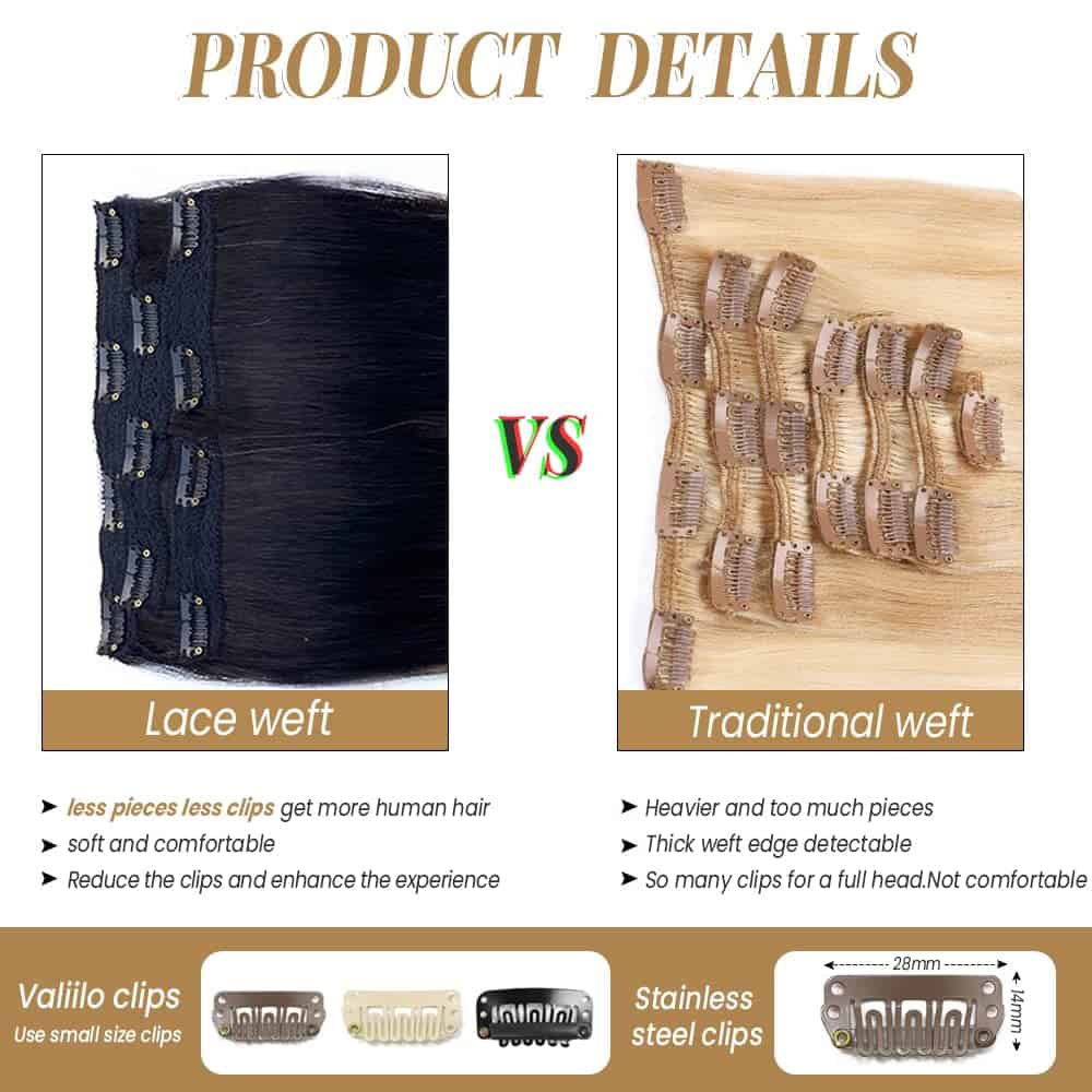 Las extensiones de cabello humano de Valiilo tienen una exquisita trama de encaje que hace que tu cabello se vea más cómodo. Las extensiones de cabello clip in humanas no tienen cinta ni pegamento, no dañan el cuero cabelludo ni el cabello, y pueden mezclarse perfectamente con el color de tu cabello. Si deseas rizarlo o alisarlo tú mismo, por favor mantener la temperatura por debajo de 180°C. Extensiones de pelo clip en cabello humano doble trama para 100g de extensiones de cabello. Tiene 11 clips en total, 4 piezas en total, 14 pulgadas: 70g, 16 pulgadas-22 pulgadas: 100g. Por lo general, 2 juegos son suficientes para hacer una cabeza completa. Extensiones de cabello Remy sin mezcla de cabello animal, sin olor químico, sin alérgenos, adoptamos tecnología avanzada de tratamiento capilar. Las extensiones de pelo real clip ins se ven naturales y suaves. Servicio de matching de color disponible, soporte para personalizar el color, por favor contáctenos.