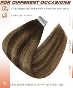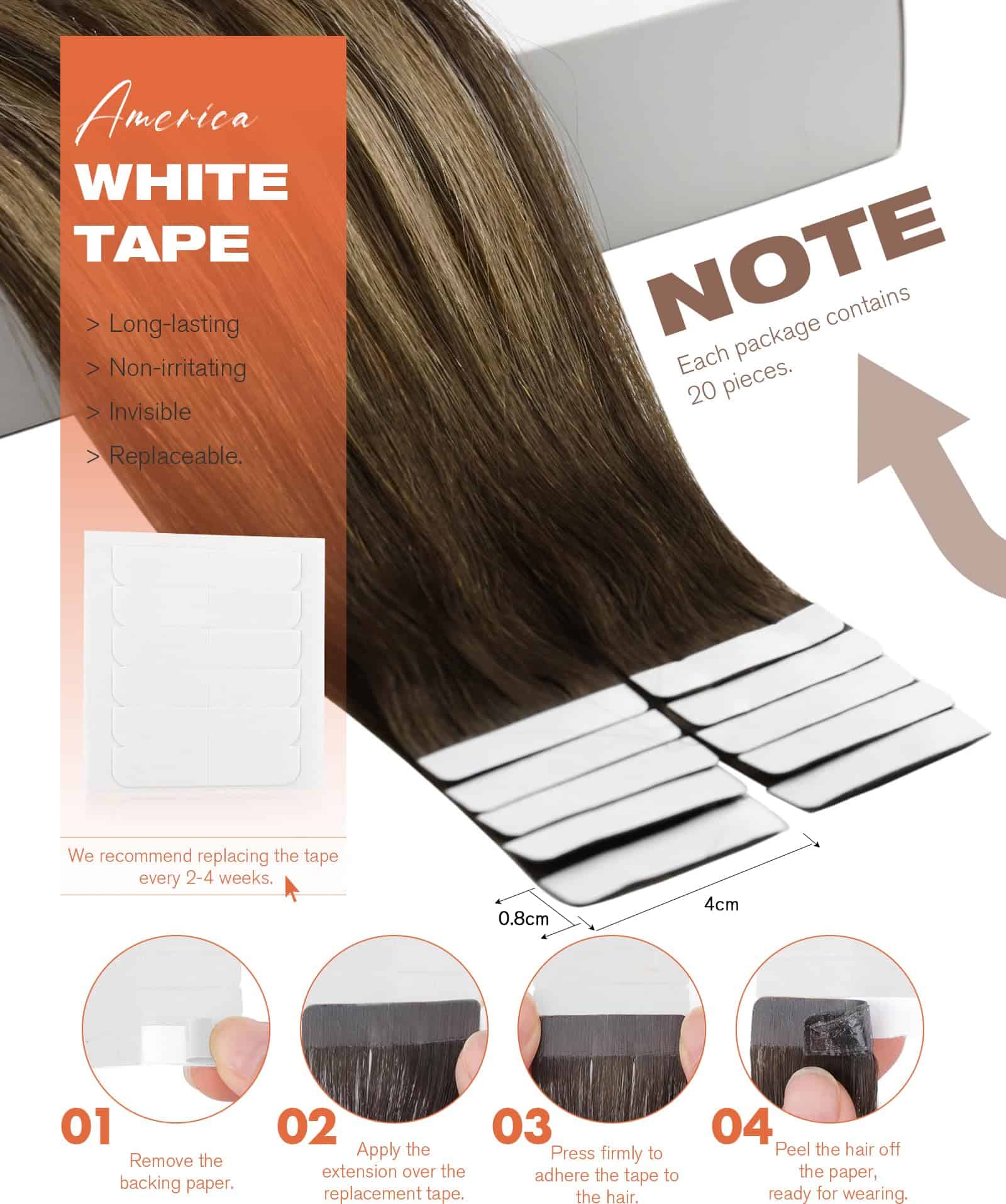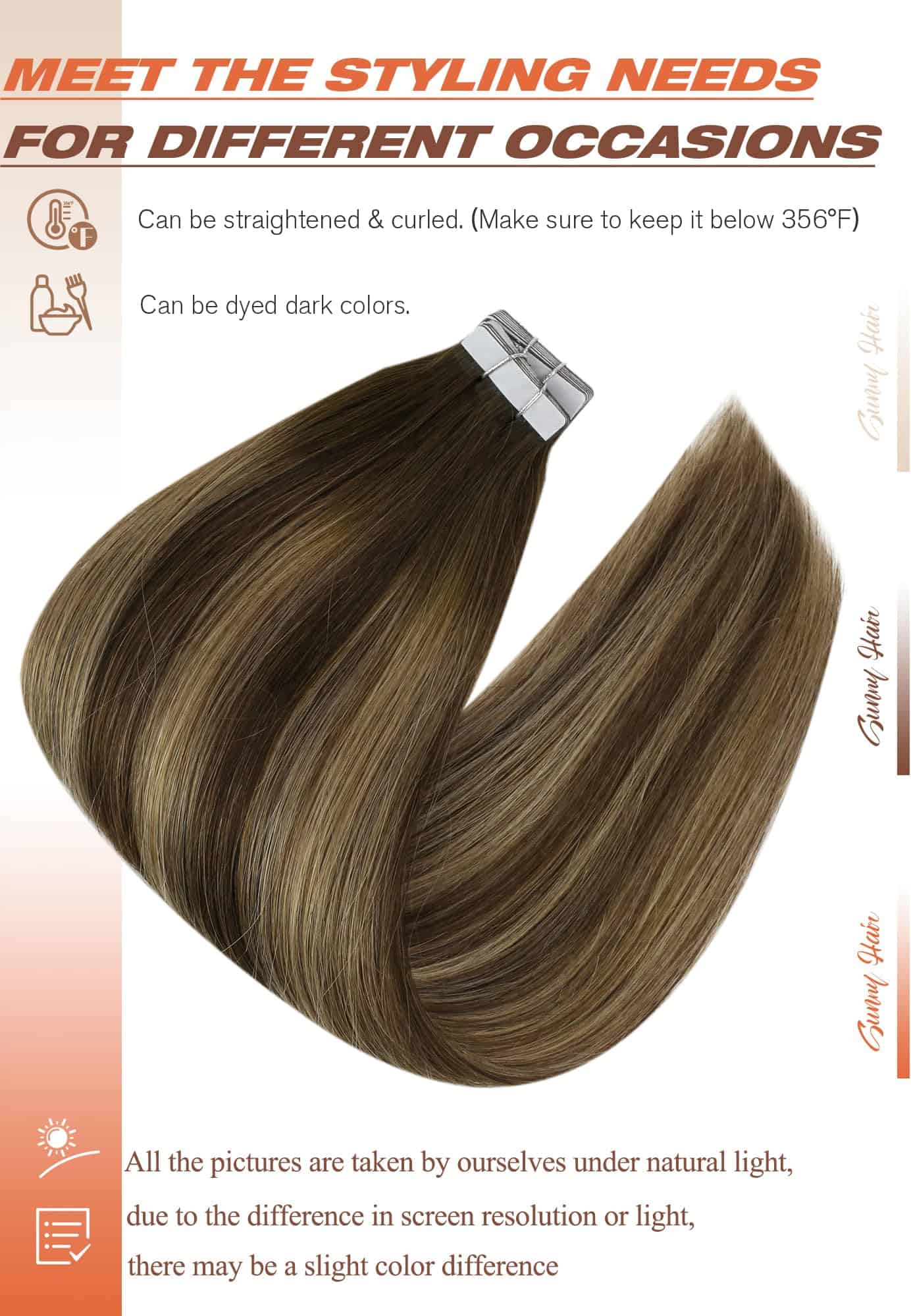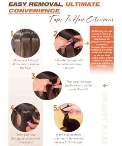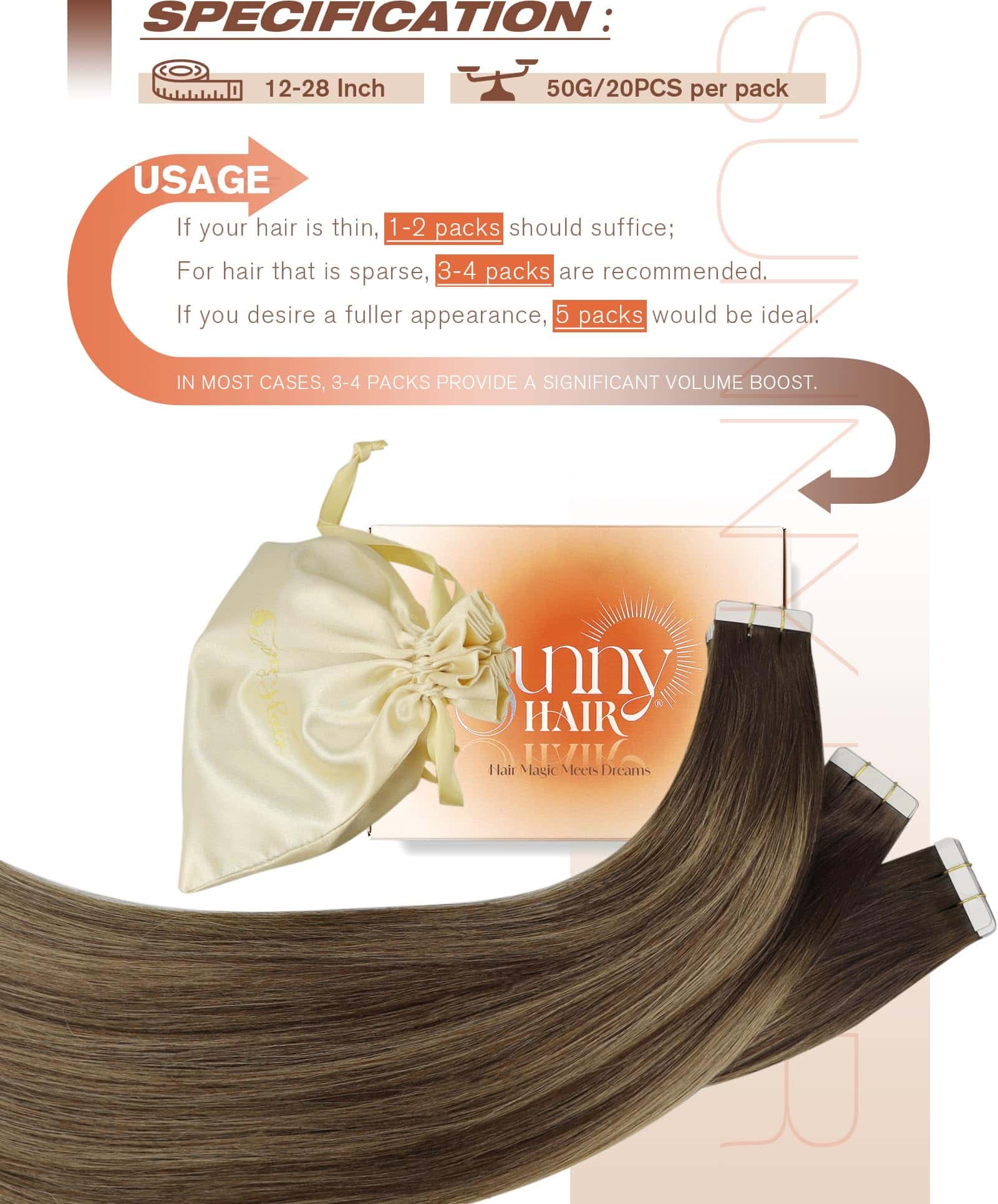 1.Say goodbye to bumps or lumps: Las extensiones de cabello con cinta Sunny Hair de cabello humano están diseñadas para ser ligeras; no agregarán peso adicional a tu propio cabello, asegurando la máxima comodidad durante todo el día y permitiendo un aspecto natural y sin costuras; Además, serán particularmente adecuadas si tu cabello es frágil o delgado; Pero no para personas con cabello muy fino o propenso a romperse o personas con cuero cabelludo sensible. 2. Vive la experiencia de extensiones de cabello duraderas y reutilizables: La cinta Sunny Hair está hecha de cinta blanca americana; fuerte e invisible hipoalergénica; Es reemplazable y cada paquete viene con una cinta de repuesto; Bajo un buen cuidado del cabello, puedes reutilizar las extensiones más de una vez; Si la cinta pierde su efecto adhesivo debido a un almacenamiento prolongado, clima caliente o uso indebido, por favor avísanos. 3. Desbloquea tu creatividad en el estilo con Sunny Hair: Todas las extensiones de cabello con cinta están hechas de cabello humano real, pueden lograr suavidad, alisado, rizado y teñido de color oscuro; Es la elección perfecta para uso diario, playa, fiesta, boda, graduaciones o una noche romántica de citas; Todas las imágenes son tomadas por nosotros mismos bajo luz natural, debido a la diferencia en la resolución de pantalla o equipo, puede haber una ligera diferencia de color. 4. Libera tu atractivo natural con las Extensiones de Cabello con Cinta Sunny Hair Human Hair: Cada juego incluye 20 piezas, diseñadas para mezclarse perfectamente con tu cabello natural; Para aquellos bendecidos con cabello grueso, 3-4 paquetes para mejorar la longitud y 2-3 paquetes para lograr un grosor lujoso; Para aquellos con cabello más fino, disfruta de 4-5 paquetes para una longitud impresionante y 3-4 paquetes para un aumento en volumen envidiable; Acepta la belleza que te espera. 5. Descubre los secretos para un cabello duradero y sedoso: Por favor, no uses acondicionador de cabello antes de la instalación; Utiliza el método de uso «Sandwich», calentar las cintas con una plancha para el cabello durante la instalación puede aumentar la adherencia; No laves tu cabello dentro de las 72 horas posteriores a la instalación y no lo uses en la piscina o la playa; Aplicar acondicionador o aceites en las puntas de tu cabello ayudará a que el cabello se mantenga brillante y sedoso.