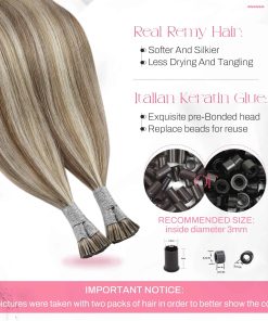 Las extensiones de cabello Moresoo Itip están diseñadas con cabello humano de alta calidad para ofrecerte una apariencia natural y sin enredos. Con la capacidad de ser estilizadas, puedes teñir el color claro a tonos más oscuros según tus preferencias. Las puntas de las extensiones están hechas de pegamento de queratina italiana, lo que garantiza una fijación segura sin preocupaciones de que se desprendan. Recomendamos 2-3 paquetes para cubrir toda la cabeza, y si deseas agregar longitud y volumen, opta por 3-5 paquetes. Con una amplia gama de colores y tamaños disponibles, estas extensiones I tip son fáciles de instalar y quitar, proporcionándote un look renovado en cuestión de minutos.