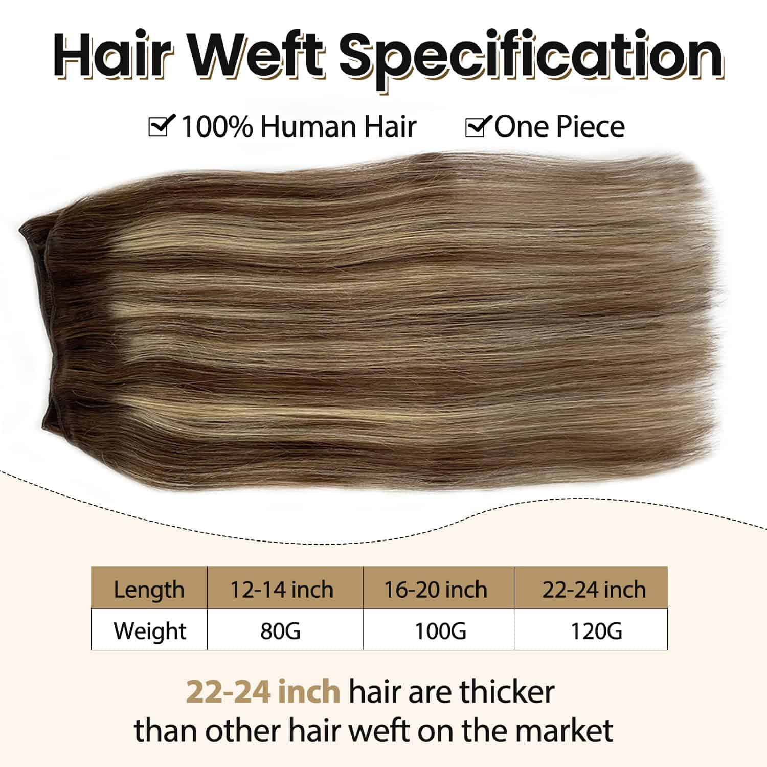 1. Especificaciones Razonables del Cabello Las extensiones de cabello cosidas a mano son 100% cabello humano real crudo, 12-14 pulgadas-80g, 16-20 pulgadas-100g, 22-24 pulgadas-120g, más gramos que otras extensiones de cabello humano en el mercado, ¡pero asequibles! Extensiones de cabello cosidas más gruesas en cabello real humano, 1 paquete para agregar volumen de cabello completo, 2-3 paquetes para cabello grueso o agregar longitud de cabello completo.