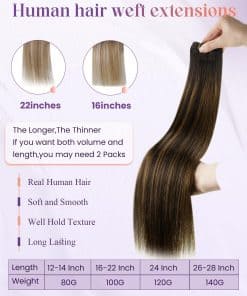 LaaVoo Weft Hair utiliza cabello humano remy y tecnología de teñido avanzada para crear una textura suave y similar a tu propio cabello. Puede ser atado de manera segura a tu cabello, evitando el desprendimiento o enredos con un cepillo de dientes anchos antes del lavado. Se recomienda usar shampoo suave y acondicionador sin sulfatos, así como aceite profesional y mascarilla capilar al menos una o dos veces por semana. Las extensiones de LaaVoo Weft Hair tienen 80g para 12-14 pulgadas, 100g para 16-22 pulgadas y 120g para 24 pulgadas. Además, hay opciones de 26 y 28 pulgadas con 140g para el color 1. Las dobles tramas brindan solidez y durabilidad. Las extensiones LaaVoo Weft Hair tienen varios colores hermosos que se pueden rizar hasta 180 grados, con ligeras variaciones de color debido a factores de luz. Si aún tienes dudas sobre el color, puedes consultar con el equipo de atención al cliente.