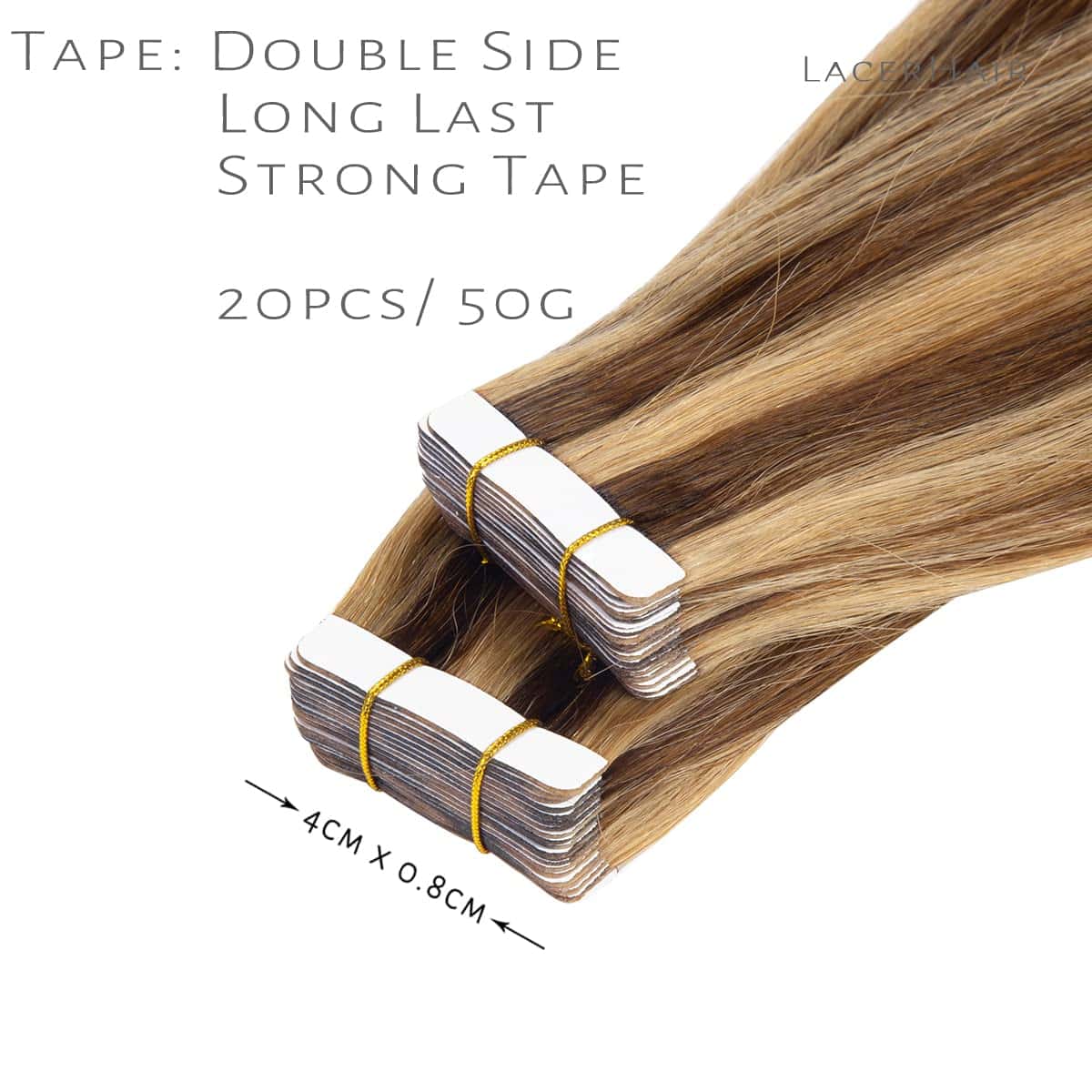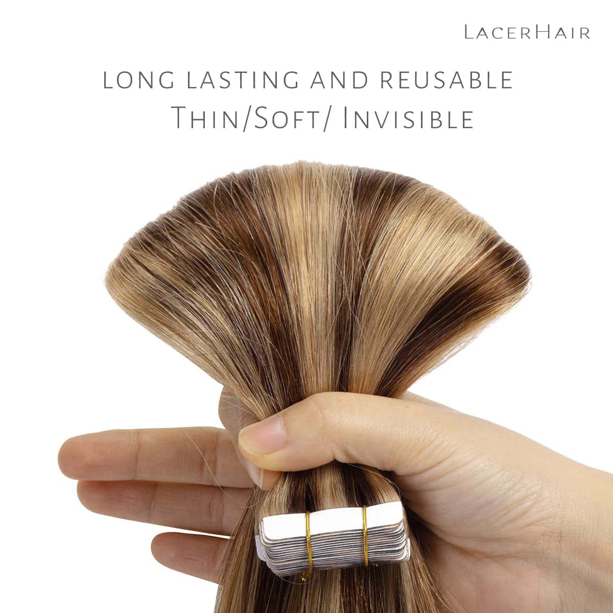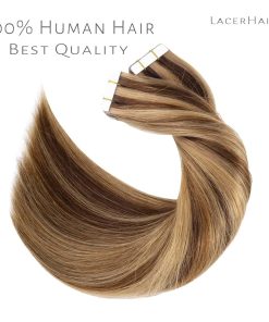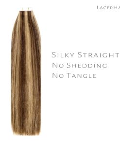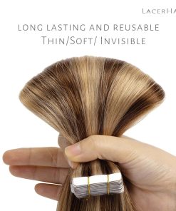 Extensiones de Cinta de Cabello Lacerhair hechas de cabello humano virgen de alta calidad que puede ser tratado y estilizado como tu propio cabello. Todas las cutículas se mantienen intactas y en la misma dirección para evitar enredos y durar mucho tiempo. Se pueden reutilizar con las pestañas adhesivas de repuesto. Provenientes de mujeres jóvenes. Pueden durar 1 año o más con el cuidado adecuado, solo necesitas reemplazar la cinta cada 4-6 semanas. Lacerhair ofrece personalización y venta al por mayor.