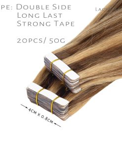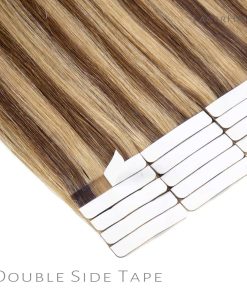 Extensiones de cinta de cabello humana remy de color de moda. Color: P4/12 Marrón Oscuro a Marrón Dorado; Longitud: 14″-22″; Cantidad: 20 piezas/paquete; 50 gramos. Hecho de cabello humano sano virgen. Puede ser teñido, alisado y rizado como tu propio cabello. Sin enredos ni caída.