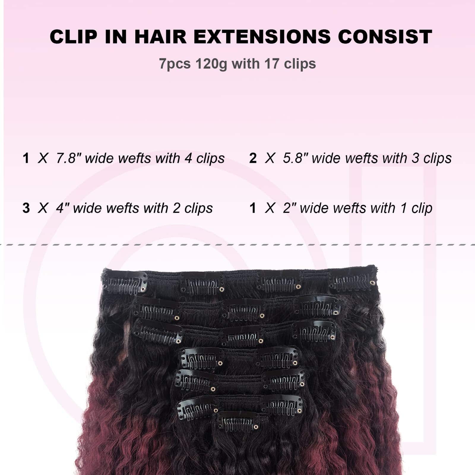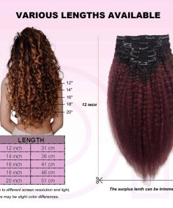 OiMiGO extensiones de cabello en clip kinky straight están hechas con cabello humano 100% natural. Disponible en diferentes longitudes y colores para elegir: 12″ / 14″ / 16″ / 18″ / 20″, 7 piezas por paquete de 120g. El diseño de 3 capas ofrece una apariencia más densa y natural. Las extensiones van desde negro a vino oscuro para un aspecto elegante. Fáciles de instalar en 4 simples pasos: separar el cabello, colocar las extensiones, asegurar los clips y peinar. Si tiene alguna pregunta, contáctenos y le proporcionaremos una solución en 24 horas.