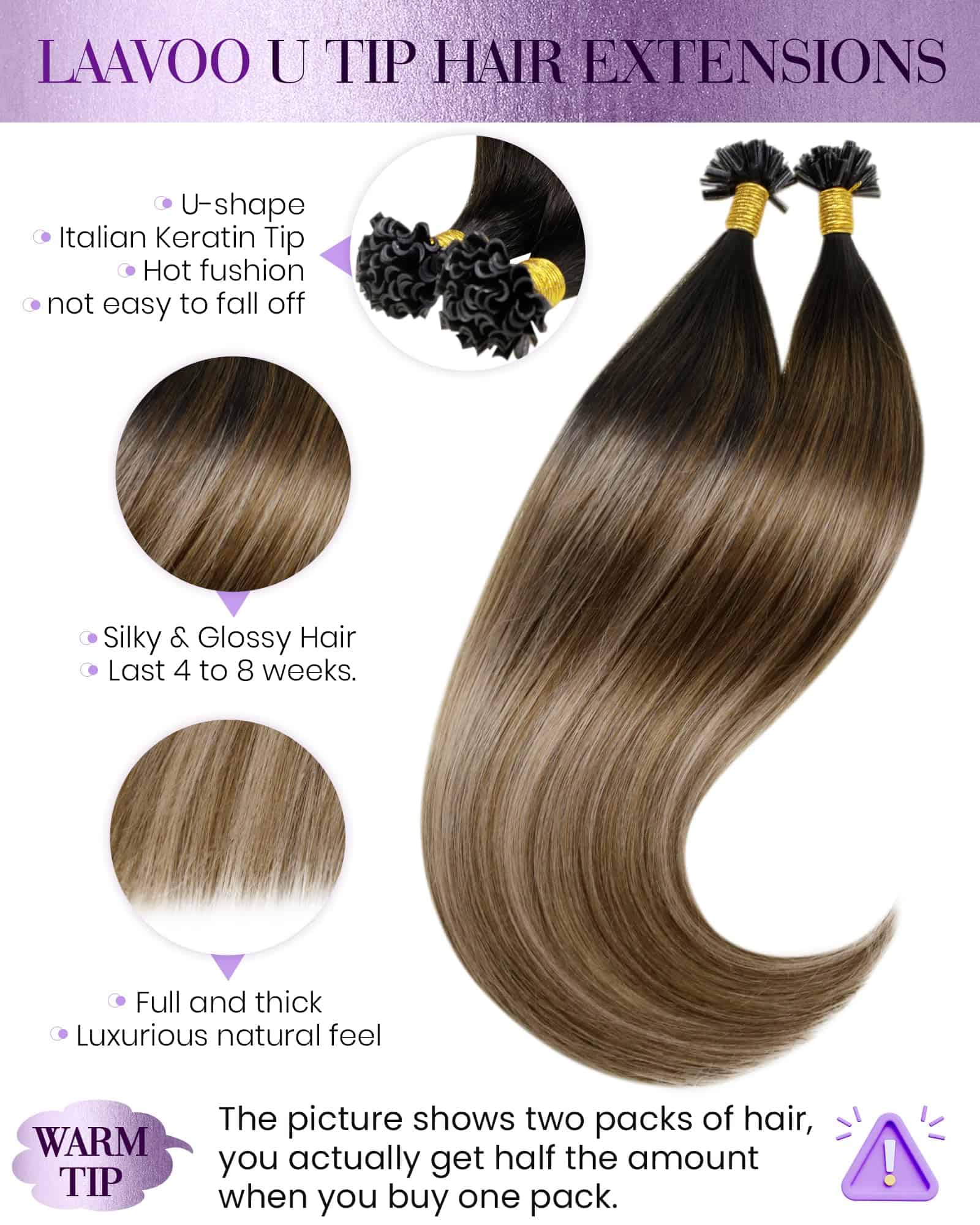 3. Especificaciones: Las Extensiones de Cabello en Forma de U de LaaVoo contienen diversos diseños de longitud, que van desde 14 pulgadas a 24 pulgadas, y cada paquete pesa 50 gramos. 2 paquetes para agregar reflejos, 3-4 paquetes de extensiones para agregar grosor.