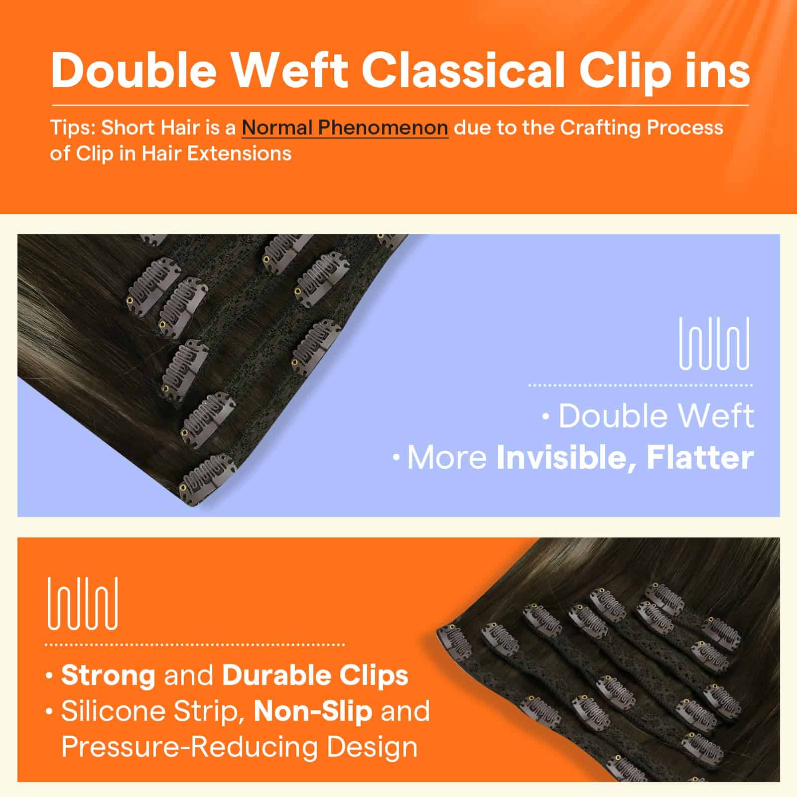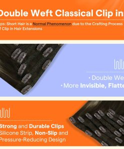 Extensiones de cabello de clip Full Shine en moreno oscuro balayage platino rubio de 12 pulgadas y 95 gramos. Estas extensiones están hechas de cabello humano Remy de primera calidad, lo que garantiza que las cutículas estén alineadas para lograr un aspecto suave y natural, sin enredos y sin caída. El diseño de doble trama proporciona mayor comodidad y durabilidad, evitando que el cabello se caiga y asegurando un ajuste seguro. Con varias opciones de color y medidas, estas extensiones pueden adaptarse a diversas necesidades capilares. El set completo pesa entre 150 a 200 gramos, facilitando la creación del estilo deseado. Con más de 30 colores de moda para elegir, que incluyen opciones de color sólido, reflejos, degradados y balayage, este producto ofrece versatilidad para adaptarse a cualquier ocasión, ya sea informal o formal. Los clips son discretos y livianos, cosidos con respaldo de goma suave para evitar irritaciones en cueros cabelludos sensibles. No causan daños en el cabello natural y se pueden ocultar fácilmente, brindando un look impecable sin comprometer la salud del cabello. La técnica de costura sin encaje hace que las extensiones sean transpirables y adecuadas para climas cálidos, reduciendo la transpiración y proporcionando una experiencia de uso ligera y cómoda. La base de las tramas está elaborada con cabellos cortos firmemente asegurados, minimizando la caída y creando una mezcla perfecta con el cabello natural. Disfruta de un look completo y glamuroso con estas extensiones de calidad.