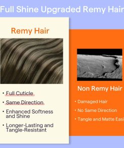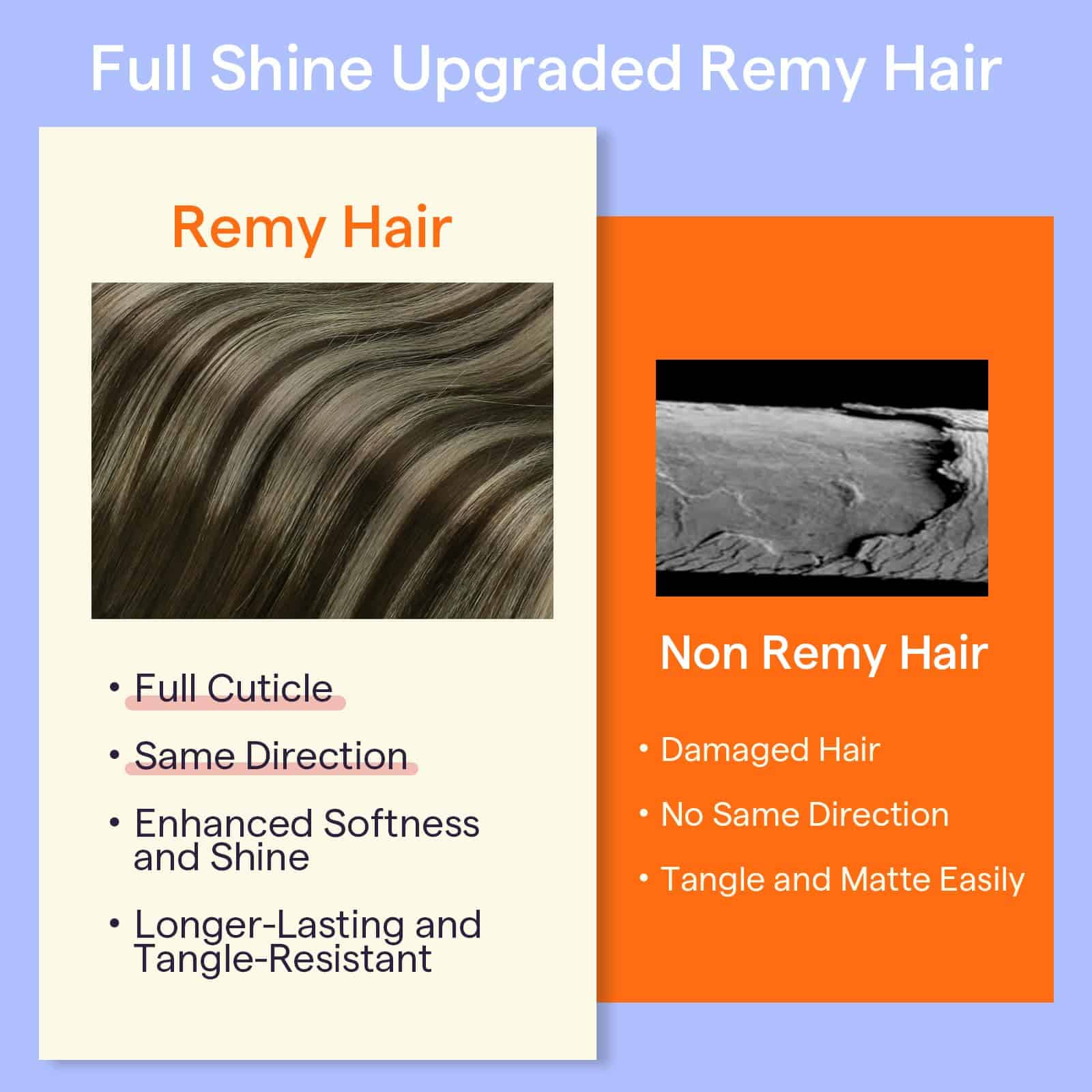 1. Cabello Remy: Elaborado con cabello humano Remy de primera calidad, asegurando que las cutículas estén alineadas para un aspecto suave y natural; sin enredos ni caída, solo hebras suaves y sedosas que se mezclan sin esfuerzo con tu propio cabello.