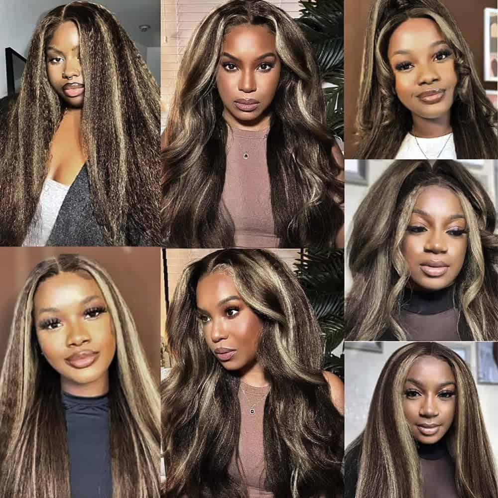 Detalles de las Extensiones de Cabello Kinky Straight P4/613 Highlight Brown Mixed With Blonde Piano Color