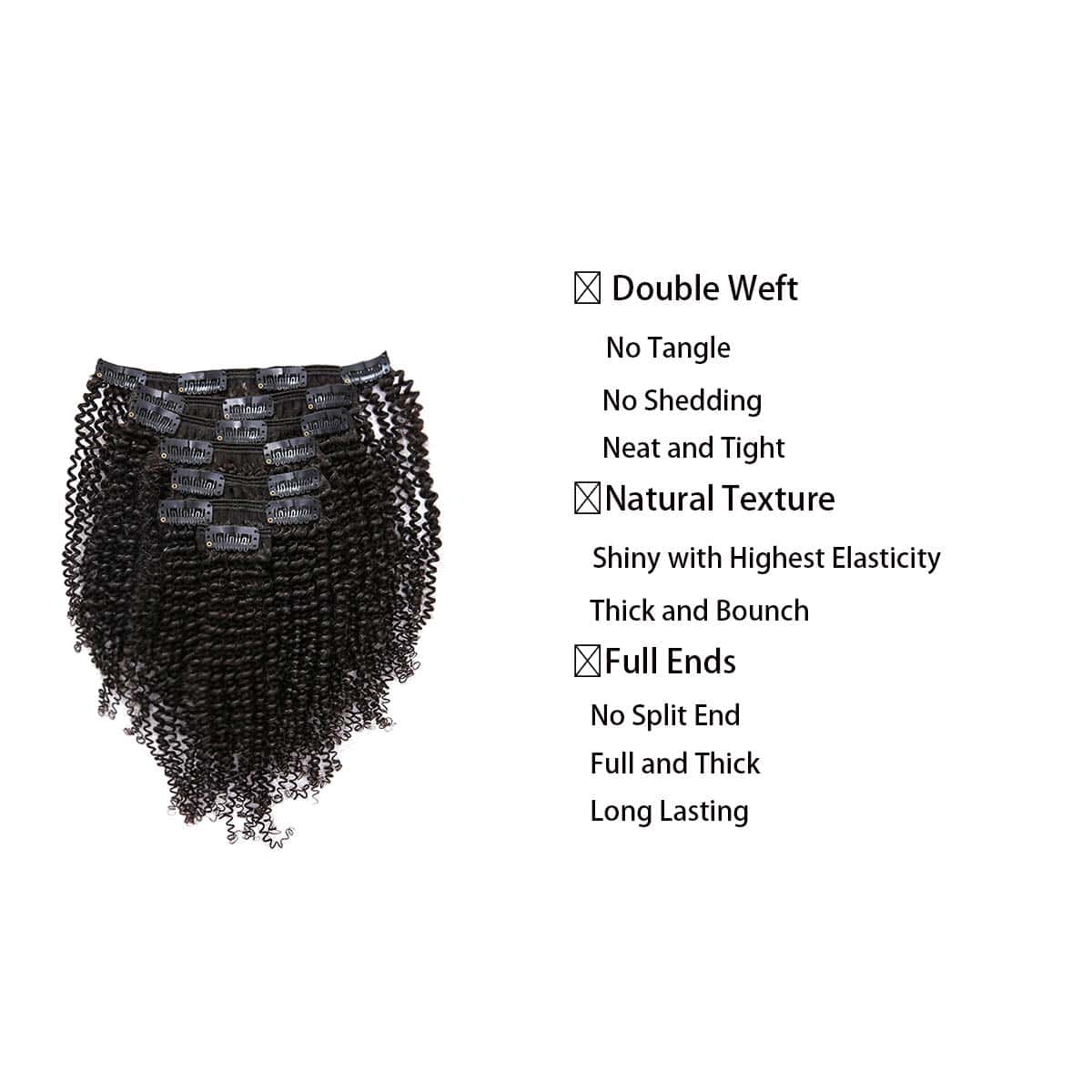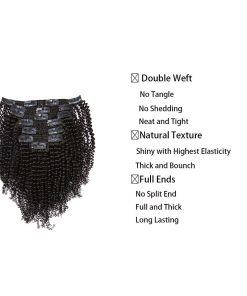 2. Peso del cabello: 7 piezas 120g con 17 clips cada paquete, las extensiones de cabello Kinkys Coily Clip in se pueden lavar, cortar, colorear, alisar como tu propio cabello. Sin derrames, sin enredos, sin piojos, se puede alisar, rizar, teñir, decolorar y estilizar según tu demanda.