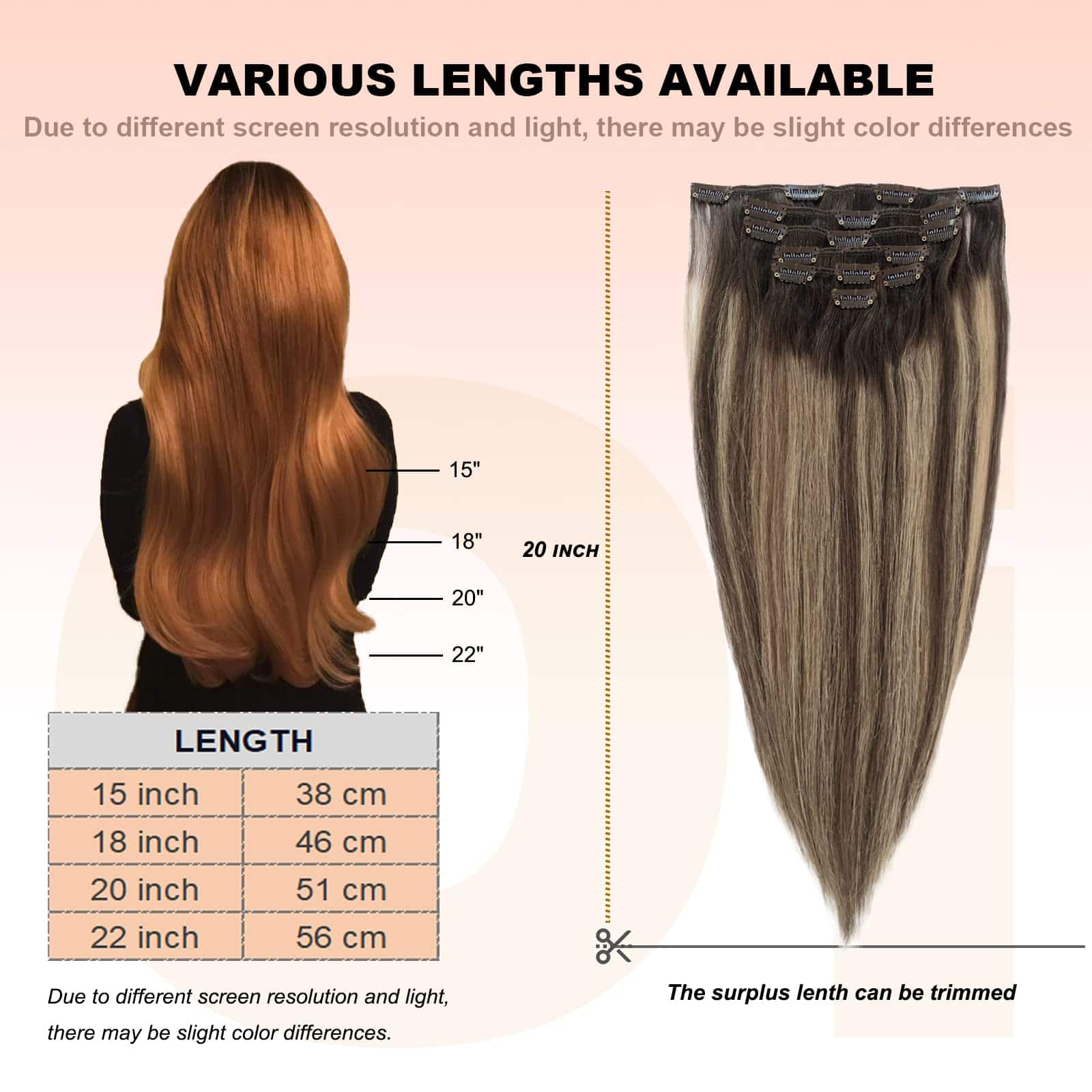 2. ESPECIFICACIONES DE EXTENSIÓN DE CLIP: 4 longitudes diferentes y muchos colores para elegir, 15″ / 18″ / 20″ / 22″, 7 piezas por paquete de 70g, 1 pieza de 8″ de ancho, 2 piezas de 5.5″ de ancho, 2 piezas de 4″ de ancho y 2 piezas de 1.5″ de ancho. Si te gusta el cabello grueso o quieres alargar tu cabello, se recomiendan 2 a 3 juegos para evitar que se adelgacen los extremos.