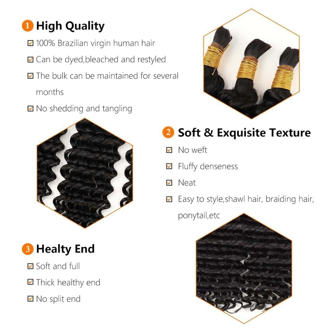 4. Más Ampliamente Utilizado el Cabello a Granel Ondulado Profundo para Trenzar y Servicio Amigable: Este no tiene trama, lo que lo hace increíblemente versátil para varios estilos de trenzas. Tales como trenzas boho, trenzas boho sin nudos, trenzas en caja, trenzas bohemias, bucles boho, trenzas africanas, giros, estilos de cabello ondulado suelto, etc. También puedes usarlo para agregar longitud y volumen a tu cabello natural. Adecuado para la vida diaria, bodas, citas, ceremonias de graduación, vacaciones, fiestas, regalos, etc. Si tienes alguna pregunta o inquietud sobre este cabello para trenzas humanas, solo contáctanos, siempre estamos aquí para ayudarte.
