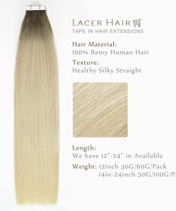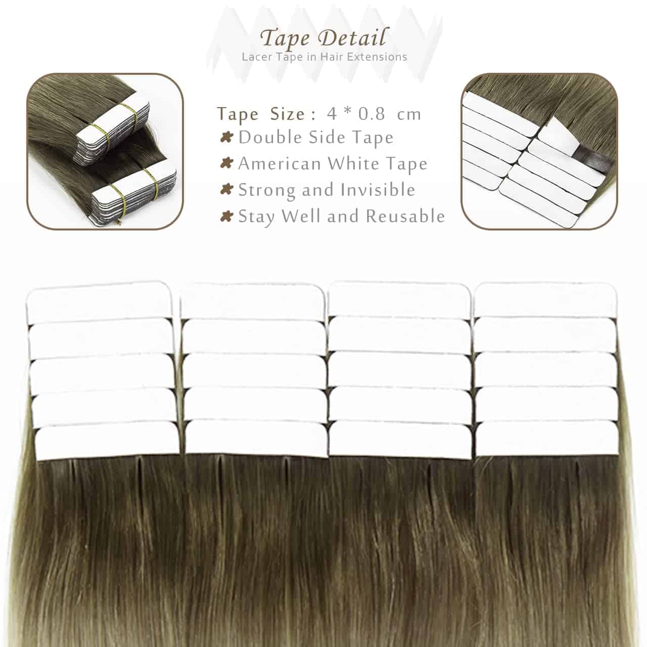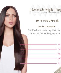 3. Cantidad recomendada– Recomendamos 2-3 paquetes para un cabello fino de cabeza completa, 3-5 paquetes para cabello más grueso. Cada paquete de extensiones de cabello humano adhesivo en cinta Lacerhair es de 50g, 20 piezas, peso ligero.