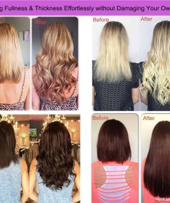 3. Fáciles de Poner y Quitar: las extensiones de tape in se instalan súper fácilmente; 1. separa tu cabello con un peine; 2. coloca el cabello de tape debajo de una fina rebanada de cabello; 3. coloca otra en la parte superior, creando un sándwich; 4. usa la plancha de cabello para alisar y dar brillo al cabello.