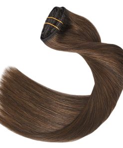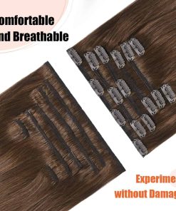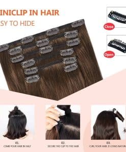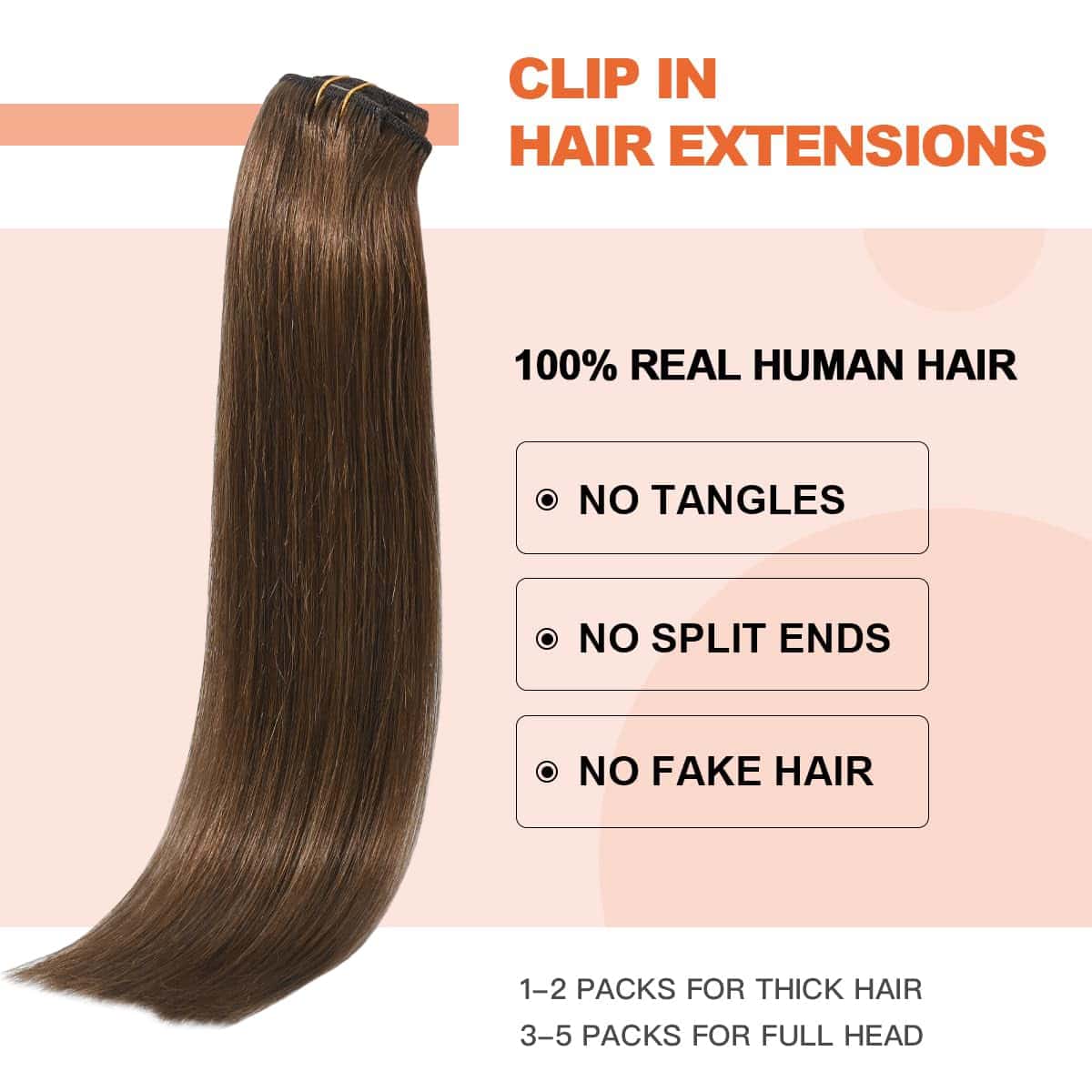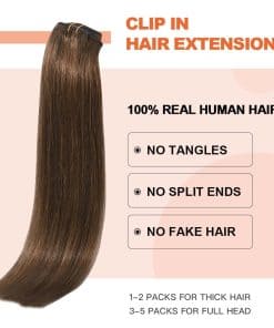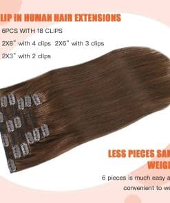2. Especificaciones de las Extensiones de Cabello Marrón: extensiones de cabello humano clip ins, su color es marrón chocolate (marrón medio), 7 piezas 70g con 16 clips por juego. Solo para espesar tu cabello, sugerimos 1-2 juegos; para una cabeza completa, sugerimos 2-4 juegos.