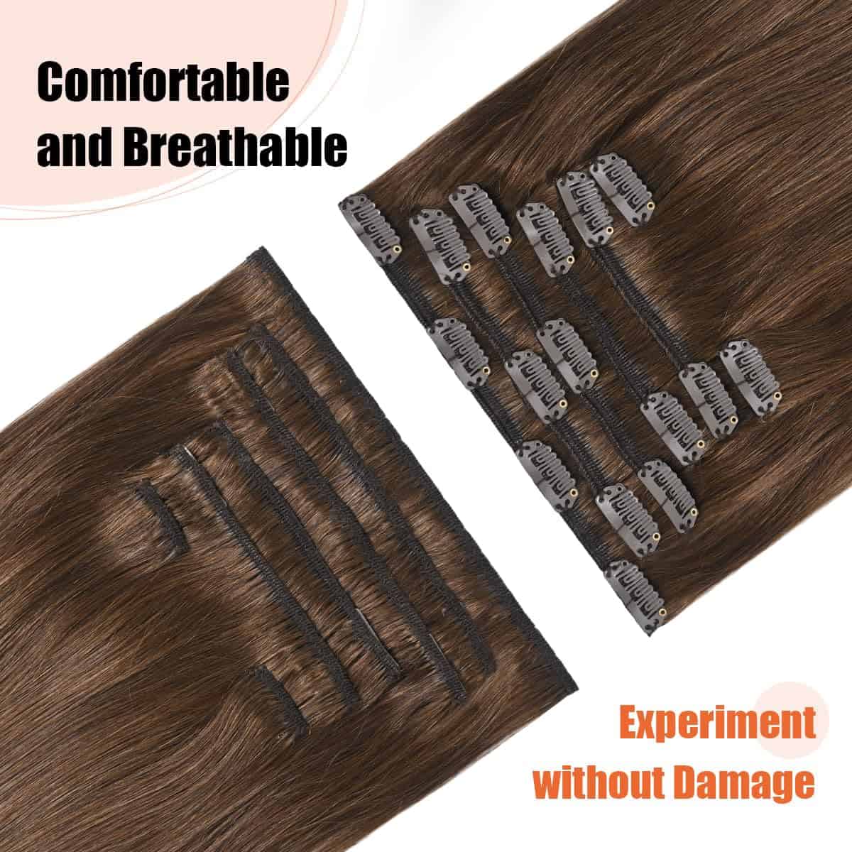 1. Calidad del Material de las Extensiones de Cabello Marrón: Cabello humano de grado 8A, extensiones de cabello humano 100% reales, sin enredos, sin caídas. Clips con respaldo de silicona son fuertes, invisibles y ligeros, protegen tu cabello natural, aseguran que tu cabello se vea natural.
