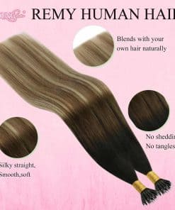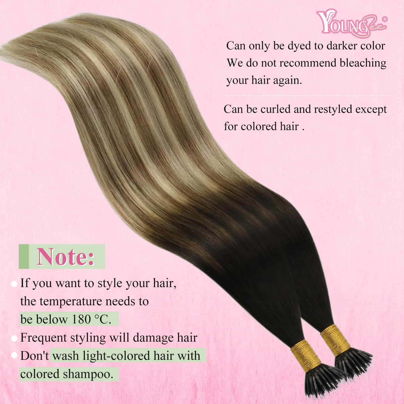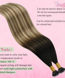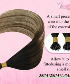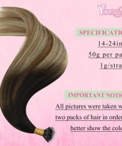 Las extensiones de cabello YoungSee nano de 14 a 24 pulgadas, 1 g/mechón, 50 mechones. 1-2 paquetes para agregar volumen, 3-4 paquetes para la cabeza completa. Nuestras extensiones de cabello nano están hechas de cabello humano real, suave y natural como tu propio cabello. Puedes volver a peinar y teñir las extensiones de cabello nano Bead de YoungSee en colores más oscuros, pero no puedes decolorarlas a colores más claros. Son más duraderas que las pelucas sintéticas y duran más tiempo. Con comodidad y transpirabilidad, son excelentes para un uso a largo plazo. Las extensiones de punta nano YoungSee con una variedad de tonos utilizando técnicas de teñido creativas, dan un acabado de cabello brillante y suave. Sin embargo, ten en cuenta que pueden ocurrir pequeñas diferencias de color debido a las variaciones de iluminación y pantalla. El uso regular de productos para el cuidado del cabello o tratamientos acondicionadores es vital para mantenerlas suaves, brillantes y manejables.