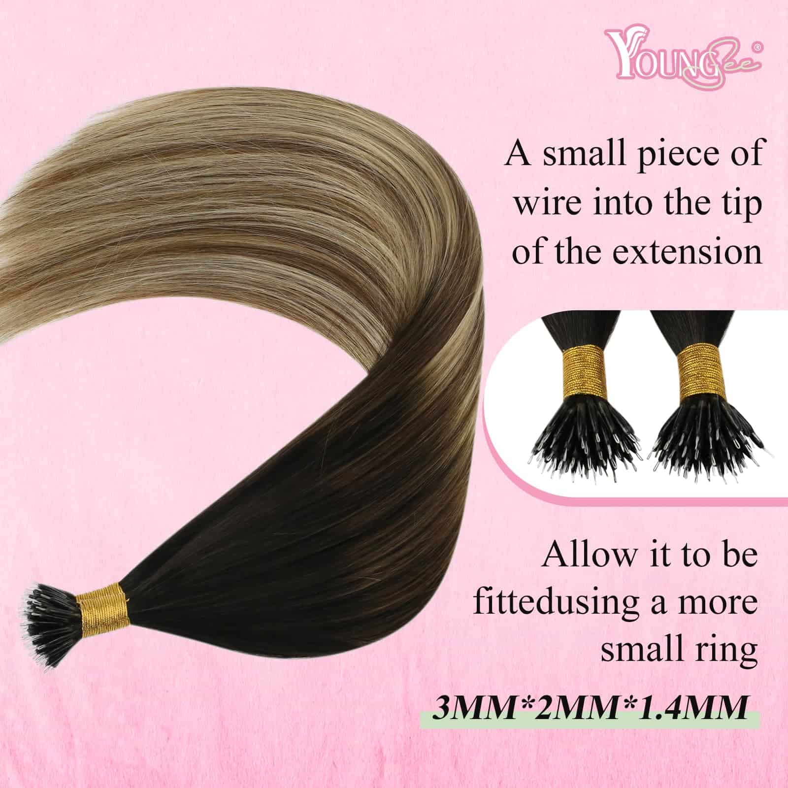 Extensiones de cabello YoungSee nano tip se sujetan usando un pequeño alambre en la punta y un anillo más pequeño. Cada mechón de cabello está individualmente preunido para ayudar a disminuir la caída del cabello. Se sugiere que un estilista profesional realice la instalación.