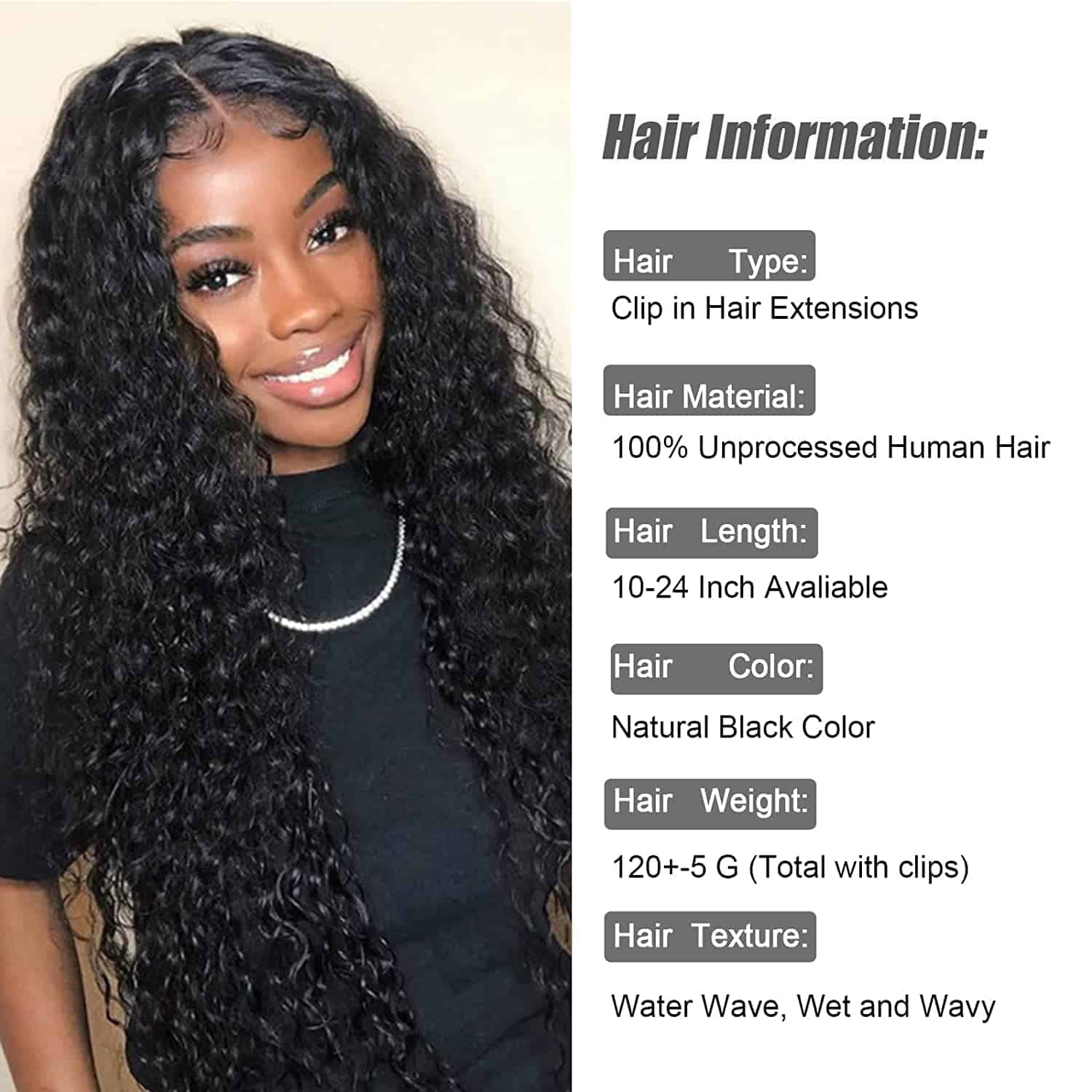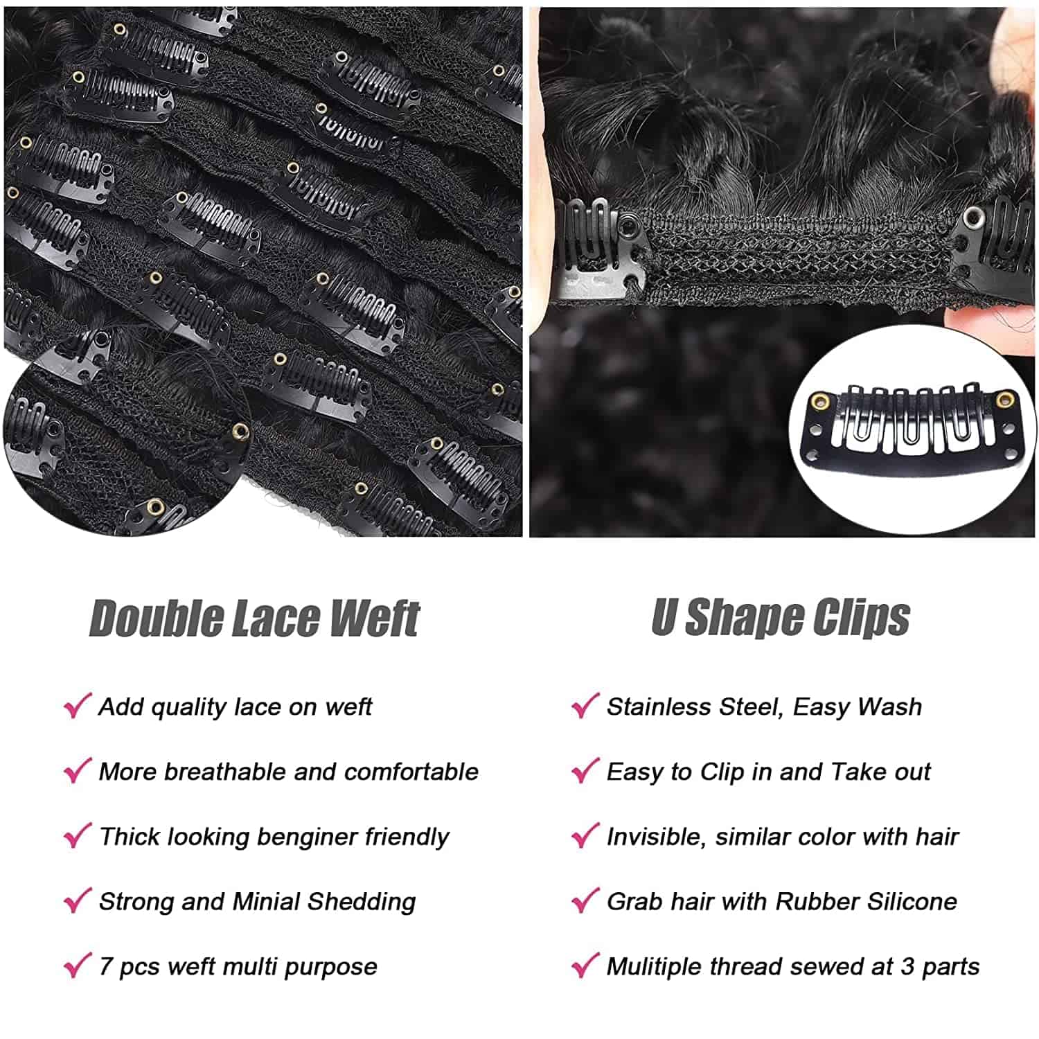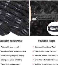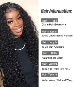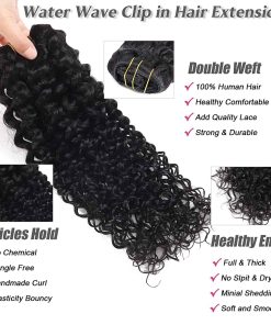 1. Las extensiones de cabello ondulado en agua de cabello humano brasileño suave están hechas con cabello remy brasileño de grado 8A, seleccionado cuidadosamente de forma fastidiosa. Extensiones de cabello natural para mujeres negras, sensación suave y sedosa, sin olor, cortadas de donantes jóvenes y saludables, color negro natural, se tiñe bien, se puede cortar, lavar, acondicionar y volver a estilizar. 2. Doble trama de encaje de máquina – Las extensiones de cabello ondulado en agua para mujeres negras agregan encaje francés flexible en una doble trama de máquina, más resistente para evitar la caída del cabello. Cabello más grueso que la típica trama individual, trama de encaje ligera con textura ondulada de agua redonda, transpirable y cómoda que la trama triple, se mezcla muy bien con tu propio cabello natural. 3. Clips de acero en forma de U seguros – Extensiones de cabello rizado con clip de cabello humano, clips de acero en forma de U de Corea del Sur, el revestimiento de silicona tiene cierta fricción para mantener las extensiones de cabello en su lugar y no daña tu propio cabello natural. ¡Hilo múltiple cosido en 5 partes para que los clips permanezcan estables incluso después de un uso frecuente! (Después de cientos de pruebas reales). 4. Fácil de instalar y mantener – Las extensiones de cabello rizado en agua son la opción preferida para la persona que desea agregar algo de longitud o plenitud adicional a su cabello en 5 minutos, súper fáciles de instalar y mantener. Los rizos del cabello permanecieron perfectos después del co-lavado. 5. Servicio de postventa de calidad – Consejos cálidos: 1 Presta atención al método de medición de la longitud del cabello, elige el tamaño que necesitas. 2: Las clip-ins regulares con 120 g, para agregar volumen o longitud extra, recomendamos 2 o 3 paquetes para un look de cabeza completa. Si tienes alguna pregunta, no dudes en ponerte en contacto con nuestro equipo de servicio, ¡te brindaremos la experiencia de compra más satisfactoria!