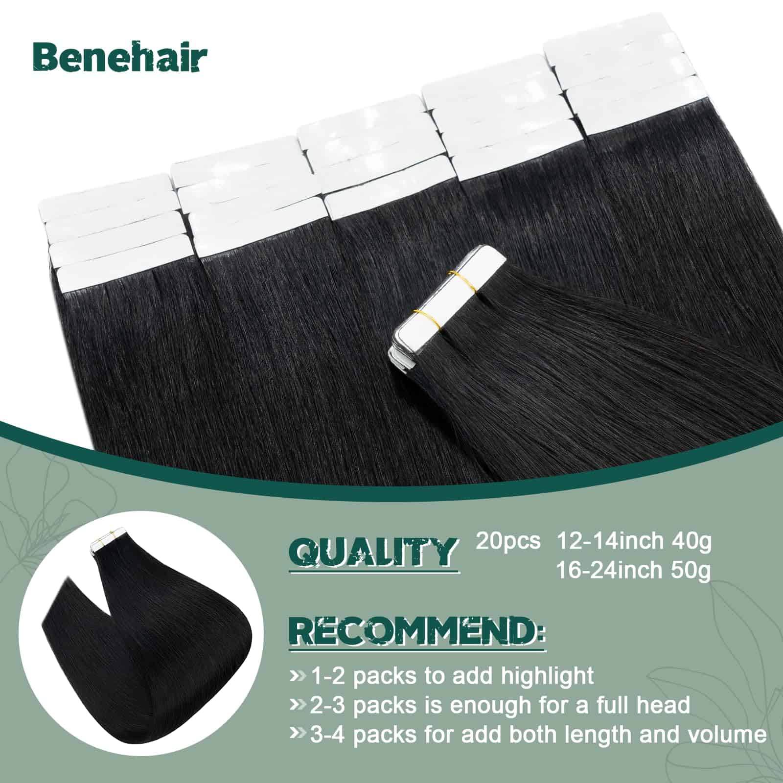 3. Especificaciones de las extensiones en cinta: Nuestras extensiones en cinta están disponibles en diferentes longitudes y pesos. Cada paquete contiene 20 piezas, con 12-14 pulgadas pesando 40g por paquete y 16-24 pulgadas pesando 50g por paquete. Se recomiendan 2-3 paquetes para cabello fino o delgado, mientras que se aconsejan 4 paquetes para cabello más grueso. Son perfectas para agregar volumen y longitud para un nuevo look impresionante.