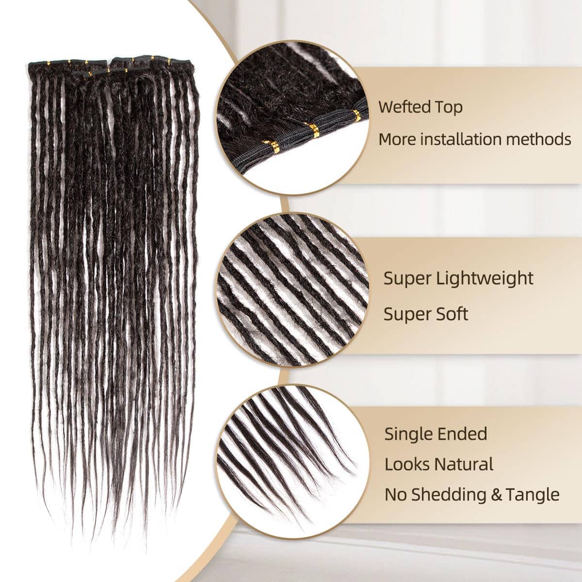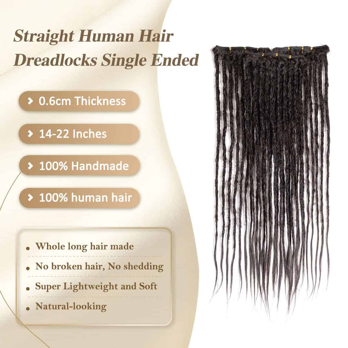 Prueba de Quemado Utiliza un encendedor para verificar que los dreadlocks sean cabello real, el cabello tiene el olor de la quema de proteínas y los residuos se pueden moler en polvo. Apretados y Rígidos Los dreadlocks hechos a mano están hechos de mechones afro rizados, si los dreadlocks son demasiado esponjosos y suaves, su vida útil se reducirá mucho, los dreadlocks se romperán. El uso y lavado repetido los hará más suaves. Detalles del Producto: Material: Trama de Cabello Humano 100% Longitud: 16 pulgadas, 20 pulgadas Grosor: extensiones de dreadlock de 0,6 cm de grosor Color de los Dreadlocks: 1B negro natural, 27 rubio, 613 rubio Paquete: dreadlocks de cabello humano con gancho de ganchillo y peine gratis. Experiencia cómoda y libre de picazón al llevar extensiones de dreadlocks, dirigido a clientes que valoran la comodidad del cuero cabelludo y el uso sin irritaciones.