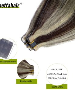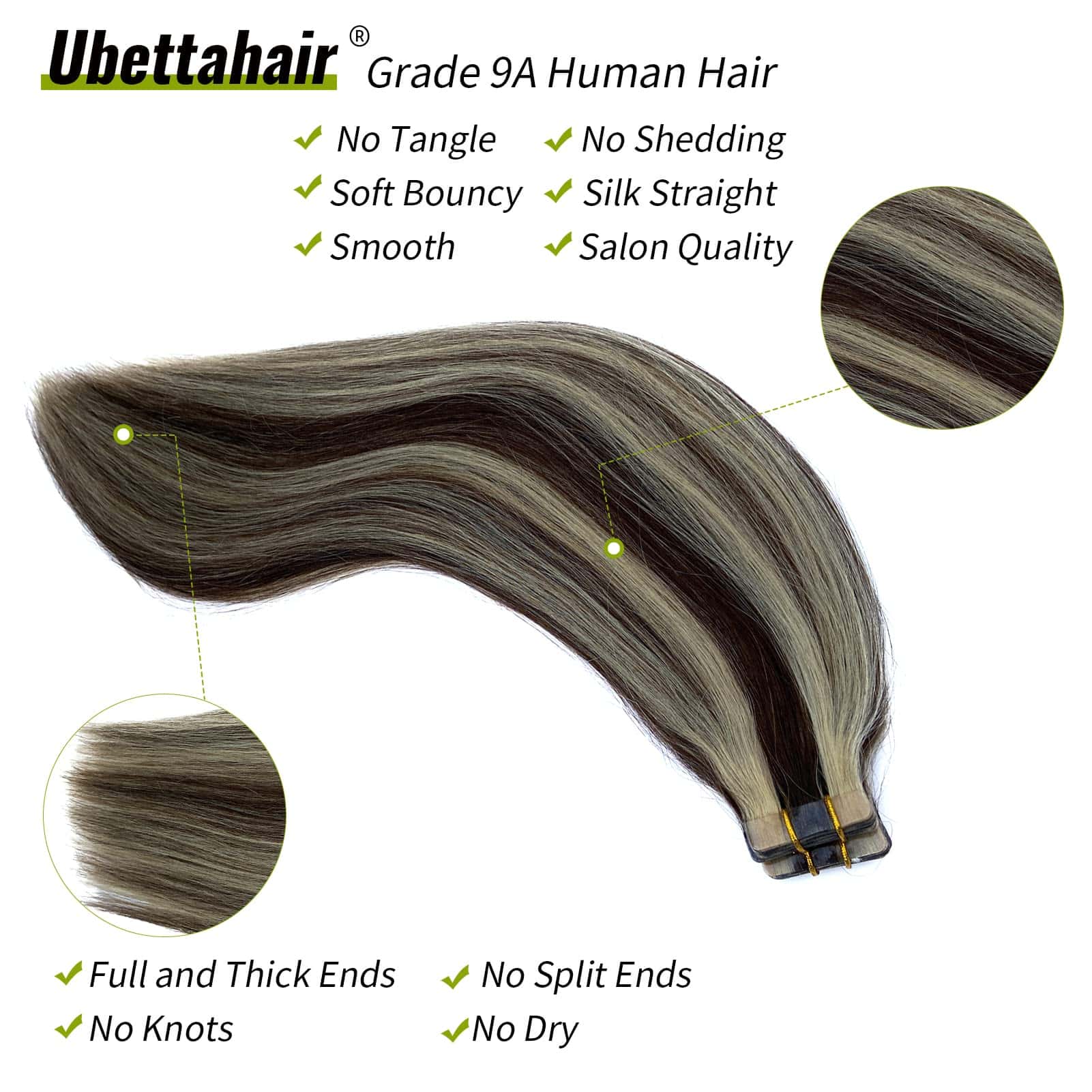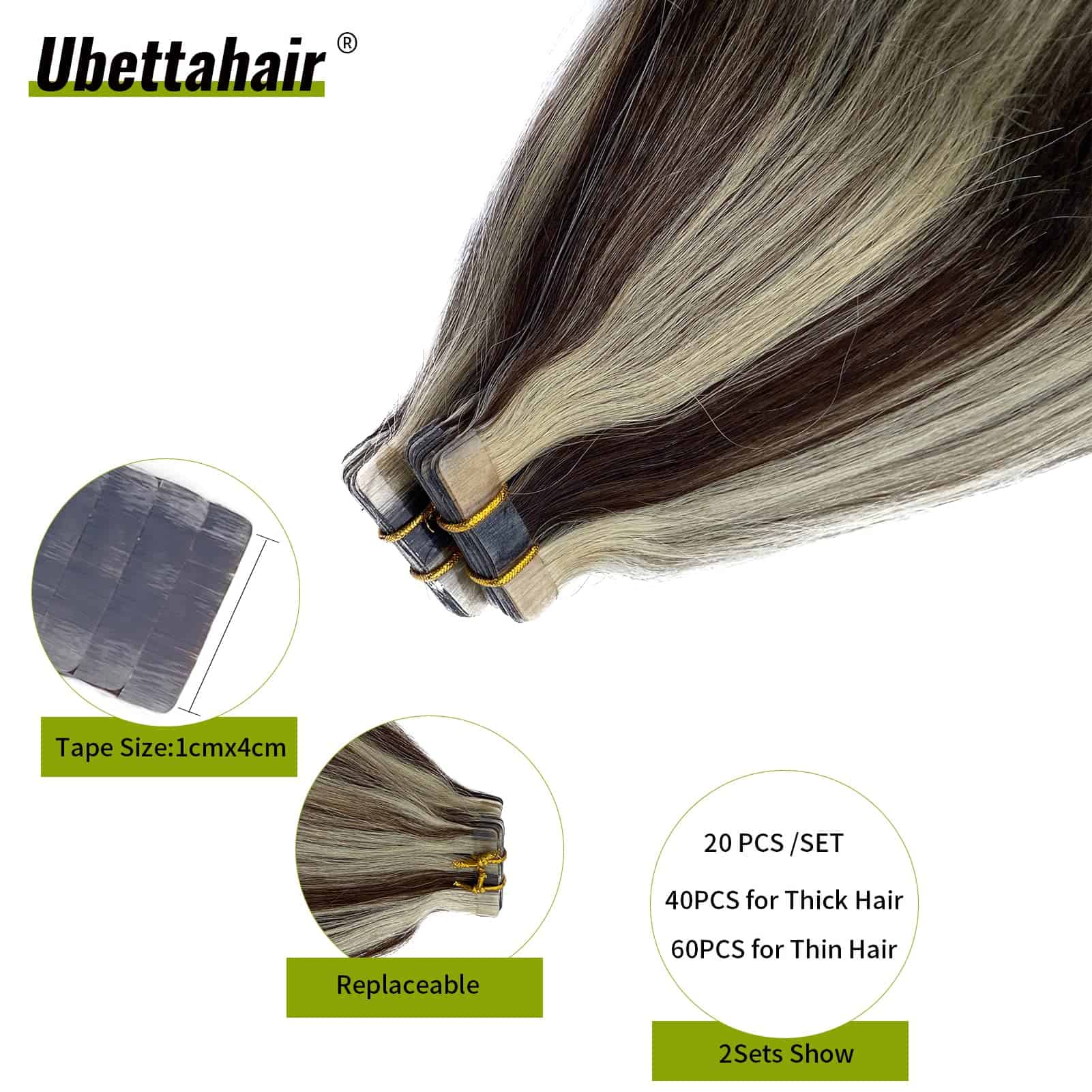 Extensiones de Cabello 9A de Calidad Premium – Extensiones de Cabello Ubetta hechas de cabello 100% alineado en la misma dirección, asegurando extensiones de calidad, sin enredos, sin caída, sin resequedad y sin puntas abiertas. El cabello es suave y saludable, puedes rizarlo a 180 grados Celsius. Extensiones de Cabello Tape reemplazables e invisibles – Extensiones de cabello tape in de doble cara, adhesivo invisible, reutilizable, hipoalergénico, sin pérdida de cabello, duradero, no se cae fácilmente. Reemplace los tapes cada 4-6 semanas. En comparación con las extensiones de clip, las extensiones de tape transparente son más invisibles, se mezclan bien con tu propio cabello, más naturales y versátiles para muchos estilos de peinado. Extensiones de Cabello de Color – Extensiones de cabello tape in de ombre balayage con destellos, disponibles en varios colores para elegir, para hacer juego con tu propio color de cabello. 16 pulgadas/30g; 18 pulgadas/40g; 20 pulgadas/50g; 22 pulgadas/60g; 22 pulgadas/70g. Fácil de obtener la longitud y volumen deseado añadiendo extensiones de cabello tape in. 20/40 piezas de Extensiones de Cabello Tape in – Ancho de 1.5 pulgadas, 20 piezas por paquete. Si tienes cabello grueso, 1-2 paquetes para aumentar el volumen y 3-4 paquetes para aumentar la longitud, si tienes cabello fino, 3-4 paquetes para aumentar el volumen y 1-2 paquetes para aumentar la longitud. Extensiones de cabello necesita más cuidados que nuestro propio cabello para prolongar su tiempo de uso. Cualquier otro problema, por favor háznoslo saber enviándonos un correo electrónico.