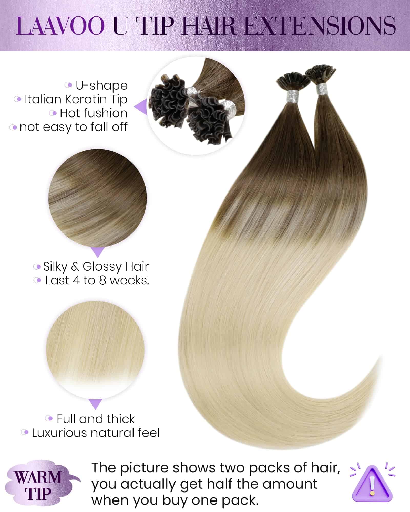 Las extensiones de cabello U Tip de LaaVoo son la elección ideal para quienes buscan un cabello más largo y voluminoso de forma rápida y sencilla. Confeccionadas con cabello humano real de alta calidad, estas extensiones se mezclan perfectamente con tu cabello natural, proporcionando un aspecto natural y sin complicaciones. El material de queratina italiana garantiza que las extensiones sean seguras y suaves para el cabello y el cuero cabelludo. Disponibles en una variedad de colores de moda, las Extensiones de Cabello U Tip de LaaVoo te permiten personalizar tu estilo y crear looks únicos. Ya sea que desees añadir reflejos sutiles o aumentar el grosor de tu cabello, estas extensiones te ofrecen versatilidad y calidad excepcionales. Con un método de fijación en forma de punta U innovador, las Extensiones de Cabello U Tip de LaaVoo son fáciles de colocar y quitar, permitiéndote disfrutar de un look impecable en todo momento. Experimenta la belleza y la comodidad de las extensiones de cabello LaaVoo y descubre un nuevo nivel de confianza en tu imagen.