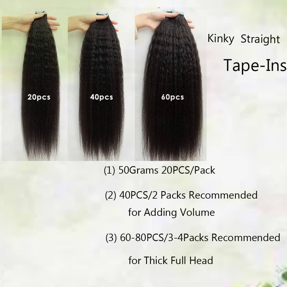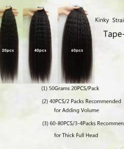 2. Grueso de arriba abajo. Nuestras extensiones de cinta rizada mantienen la misma textura de arriba abajo; Longitud: 12-24 pulgadas, 2.5g / pieza, 20 piezas / 50g / paquete. Se recomienda comprar 1-2 paquetes para cabello grueso, 3-5 paquetes para cabello fino.