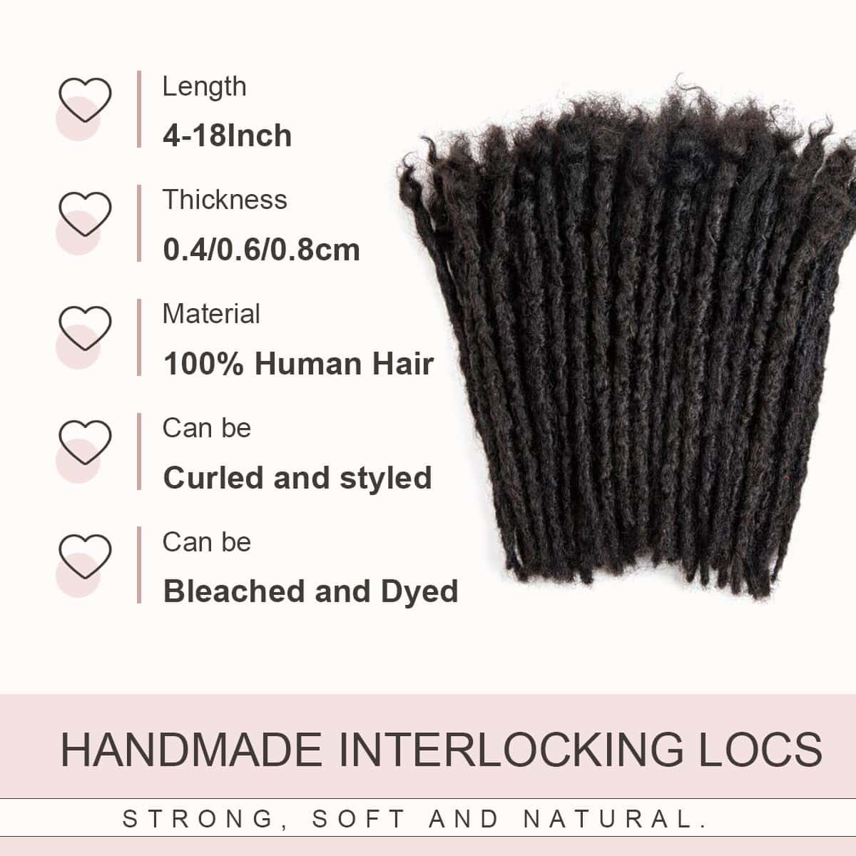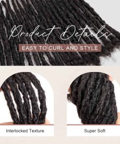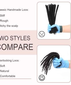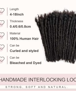 Extensiones de locs permanentes hechas a mano con aspecto natural. Pueden blanquearse hasta alcanzar un color claro 613 como máximo, también se pueden tenir de color oscuro después de blanquear. También es posible estilizarlas con puntas de colores. Las locs de 6 pulgadas están hechas de cabello afro de 6-8 pulgadas; las locs de 8 pulgadas están hechas de cabello afro de 8-10 pulgadas; las locs de 10 pulgadas están hechas de cabello afro de 10-12 pulgadas. El interlocking no se deshace. La parte superior del cabello afro rizado facilita la instalación, también se pueden extender para añadir longitud o reparar locs. Se pueden lavar normalmente. Daixi Dreadology también ofrece extensiones de dreadlock hechas a mano con un grosor de 0.2-0.8cm y pelucas de locs.