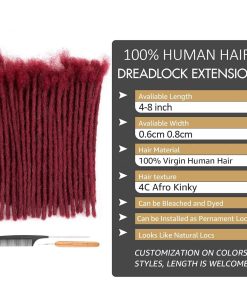 Extensiones de rastas de pelo humano real de 0,6 cm y 0,8 cm de grosor #Bug de color 4 pulgadas 30 mechones hechos a mano para hombre/mujer Extensiones de rastas permanentes que se pueden teñir, decolorar, rizar y torcer. Las rastas Daixi están fabricadas con cabello humano rizado afro al 100%, suaves, ligeras y de aspecto natural. Se pueden DECOLORAR, TEÑIR, RIZAR y TORCER. Las extensiones de rastas hechas a mano están hechas con gran atención al detalle, garantizando un grosor consistente, rastas apretadas y un acabado natural. Las extensiones hechas a mano suelen ser más duraderas y personalizables. Las rastas 100% hechas a mano tienen una textura y apariencia que se integra perfectamente con las rastas naturales, permitiendo que se puedan lavar, peinar y mantener como las rastas naturales. Más firmes que las rastas de cabello propio, el costo de mantenimiento es menor. ¿Quieres rastas más largas y espesas en minutos? No tienes que esperar a que crezca tu cabello natural. Las extensiones de rastas te dan longitud y grosor inmediatos, perfectas para aquellos que desean rastas más voluminosas. Las extensiones de rastas te permiten experimentar con diferentes peinados, colores y longitudes sin alterar permanentemente tu cabello natural. Protege tu cabello natural mientras experimentas con nuevas apariencias de rastas. Las rastas Daixi se pueden lavar, peinar y mantener como las rastas naturales. Las extensiones de rastas son más firmes que las rastas de cabello propio, por lo que el costo de mantenimiento es menor. Se pueden reutilizar varias veces. El embalaje incluye 10-100 rastas/pack con herramientas de calidad para rastas, gancho/aguja de ganchillo y peine de cola de rata. Se pueden cortar a la longitud que desees, generalmente 30-60 mechones para hacer una cabeza completa.